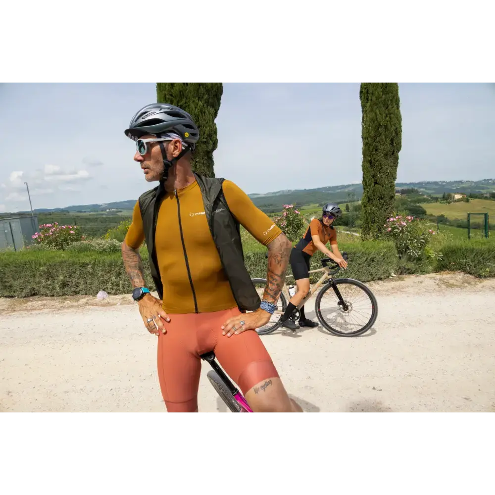 Het Texas windvest is een hoogwaardig technisch kledingstuk dat is ontworpen om windbescherming, ademend vermogen en comfort te bieden tijdens fietstochten. De tweeweg-YKK®-rits zorgt voor optimale ventilatiecontrole. De achterkant van mesh garandeert uitstekend ademend vermogen en elasticiteit, wat de pasvorm en bewegingsvrijheid verbetert. Een uniek kenmerk zijn de twee zijopeningen, waarmee je snel en praktisch bij de zakken van je shirt eronder kunt. De kraag met elastische inzet sluit perfect aan en de elastische siliconen zoom houdt het vest op zijn plaats. Dit maakt het Texas Vest de ideale keuze voor fietsers die een licht, praktisch en zeer performant windstopper-vest zoeken.