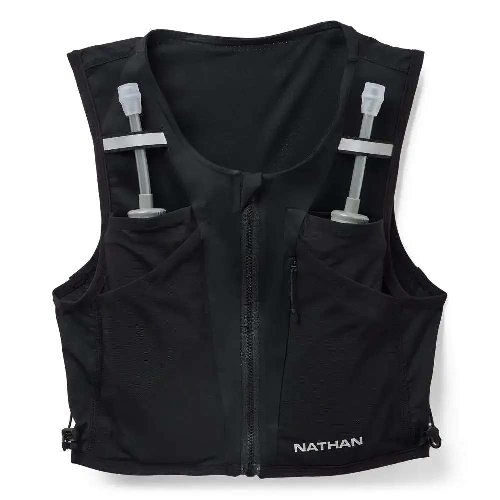 De Nathan AeroZip 1L is het ultieme minimalistische drinkvest, geïnspireerd door hardlopers die alleen het essentiële willen meenemen. Dit high-performance vest is gemaakt van ultralichte stretch- en meshstoffen met minimale naden voor een ongeëvenaard 'tweede huid'-gevoel. De unieke 'Precision Fit' is een aerodynamisch compressie-ontwerp met een rits aan de voorzijde, wat zorgt voor een absoluut stabiele en schuurvrije pasvorm zonder enige beperking in je beweging. Dankzij de 'Quick-Fit' koorden kun je de pasvorm micro-verstellen voor perfectie. Het volledig uit mesh opgebouwde rugpaneel zorgt voor maximale ventilatie, waardoor dit het ideale vest is voor snelle trainingen en wedstrijden.