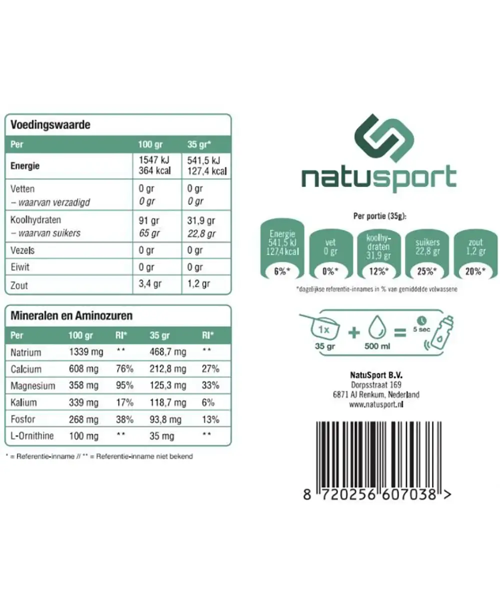 NatuSport Isotonic Sportdrink is een sportdrank met 10% meer elektrolyten (mineralen) in vergelijking met andere sportdranken, om nog effectiever te zijn dan voorheen. Het is gemaakt om koolhydraten en elektrolyten aan te vullen die verloren zijn gegaan tijdens de inspanning. Door het gebruik van echt fruit geeft het een lichte smaak die je zal verrassen, maar zonder je maag en andere delen van je spijsvertering onnodig te belasten. Goede hydratatie is de sleutel tot sportieve successen. De NatuSport Isotonic Sportdrink bevat een mix van koolhydraat-oplossingen die snel geabsorbeerd kunnen worden en de opname van vocht vergroten tijdens lichamelijke inspanningen. De sportdrank is ontwikkeld voor een optimale hydratatie dankzij de isotonische formule. Dankzij deze Isotone samenstelling wordt deze drank nog sneller dan water opgenomen in het lichaam. Bij intensief sporten verliest het lichaam snel vocht en elektrolyten (mineralen). Met de NatuSport Isotonic Sportdrink vul je dit razendsnel weer aan.