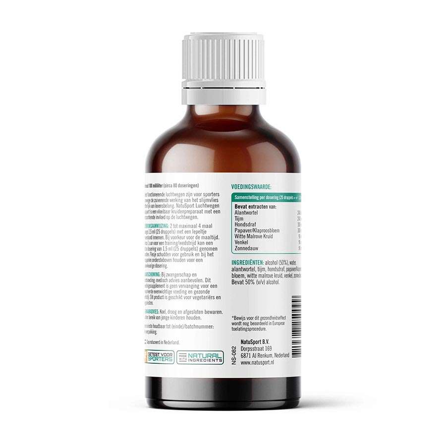 Als duursporter weet je natuurlijk dat de werking van je longen en luchtwegen cruciaal zijn voor je prestaties. De longen moeten je spieren van zuurstof voorzien om een optimale verbranding van voedingsstoffen tot stand te brengen. Aangezien de vraag voor zuurstof enorm toeneemt tijdens het sporten is een goede werking van de longen en het slijmvlies van levensbelang. Daarom heeft Natusport de Luchtwegen Support ontwikkeld. Dit vloeibare kruidenpreparaat heeft een verzachtende invloed op de luchtwegen. Dit wordt onder andere bereikt door het gebruik van echte Tijm en een extract van Zonnedauw en Alantwortel welke een ontspannend effect hebben op de slijmstoffen in de luchtwegen. Geef je spieren weer lucht met de Luchtwegen Support!