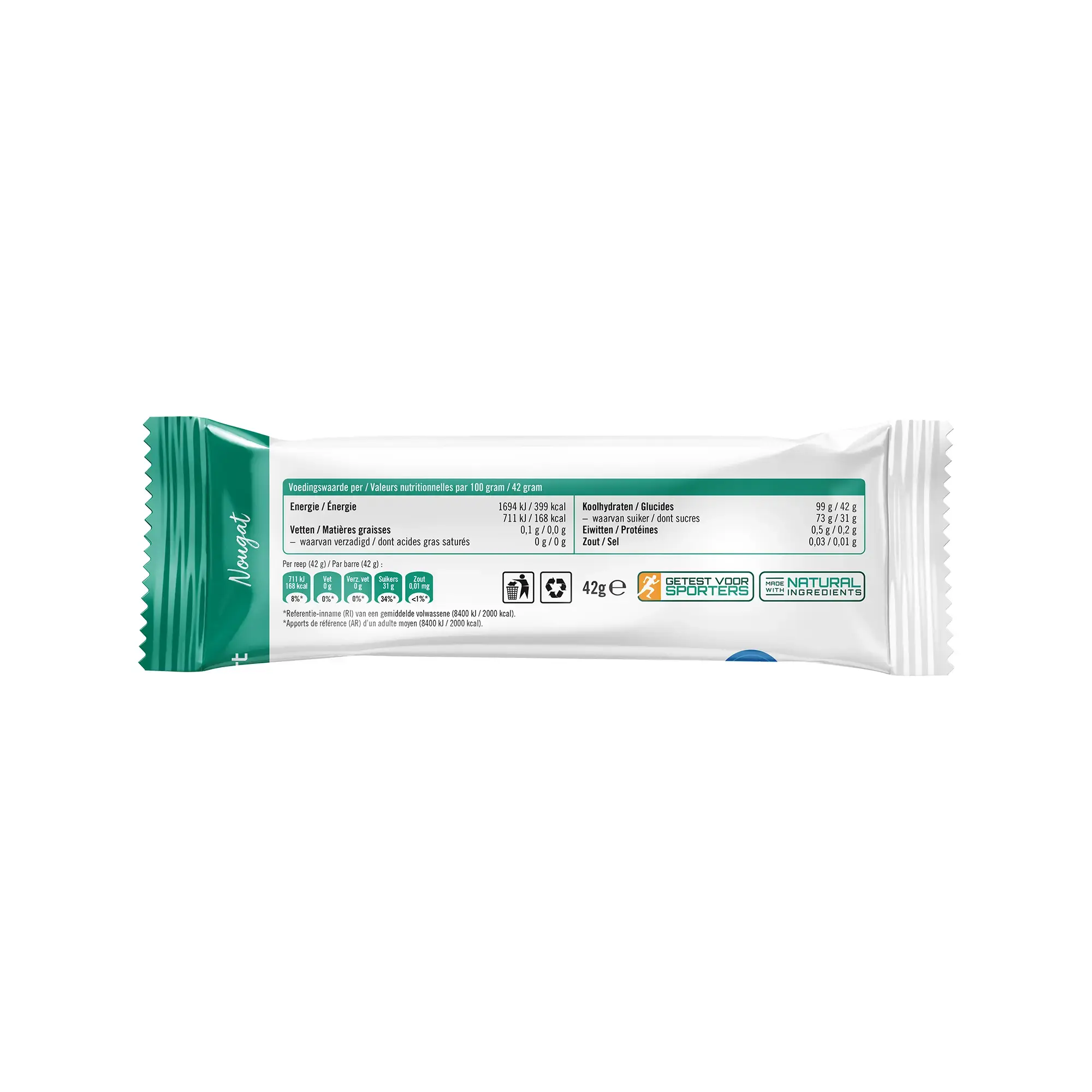 De nieuwe Natusport Nougat Sport Bar bevat 40 gram koolhydraten per reep van 41 gram en is daarmee de koning onder de nougatrepen. De reep bestaat vrijwel uitsluitend uit snel opneembare energie. De koolhydraten zijn samengesteld in een 2:1 verhouding van glucose en fructose. Binnen sportvoeding is dit een veelgebruikte combinatie, omdat glucose en fructose via verschillende transportsystemen in de darm worden opgenomen (SGLT1 voor glucose en GLUT5 voor fructose). Door deze combinatie kunnen beide koolhydraatbronnen gelijktijdig worden benut binnen het normale koolhydraatmetabolisme. De zachte nougattextuur maakt de reep makkelijk te eten, ook tijdens intensieve inspanning of koud weer. Geen taaie, droge reep, maar een soepele, goed verteerbare energiebron.