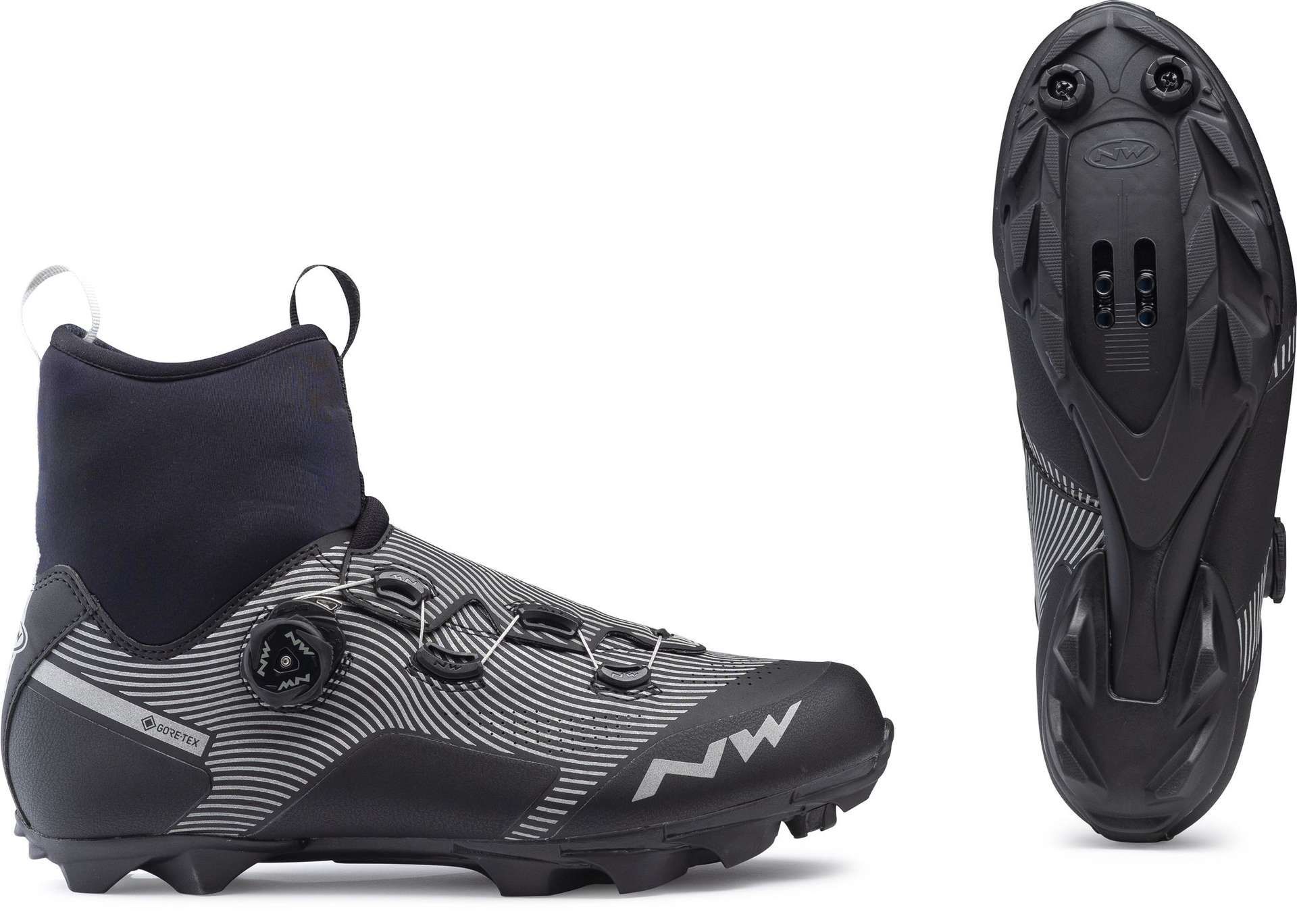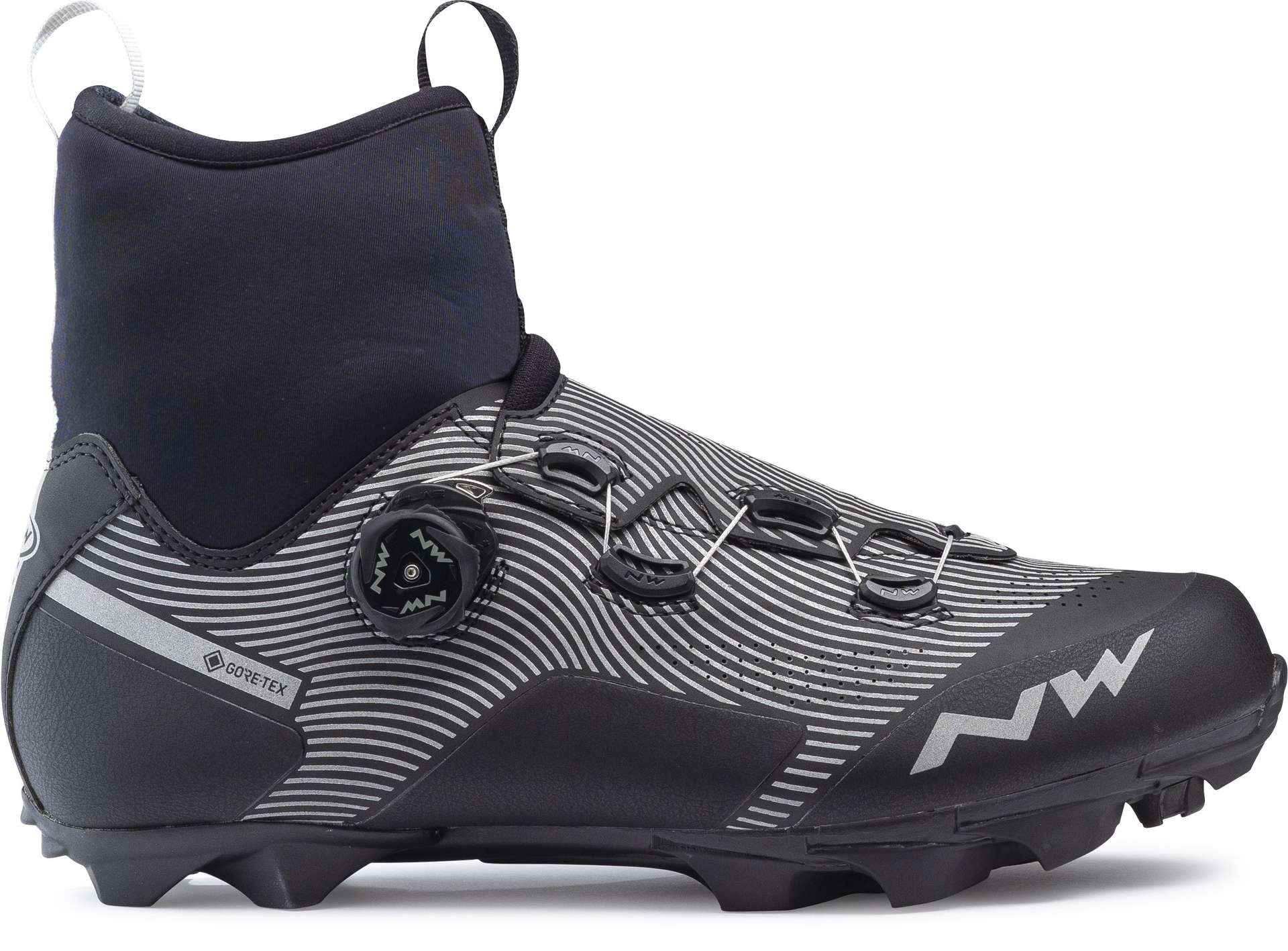 De Northwave Celsius XC GTX mountainbikeschoenen zijn ideaal om mee te fietsen in milde winterse omstandigheden. Deze schoenen zijn extra hoog waardoor ze tot de enkel komen en sluiten ook erg mooi aan. Het GORE-TEX membraan zorgt ervoor dat de schoen waterdicht is, winddicht is en ook nog eens een erg goed ademend vermogen heeft. De zool is versterkt met carbon en heeft een stijfheidsindex van 8.0 waardoor je al je kracht goed op de pedalen kan overbrengen. Het SLW2 dial vetersysteem is zeer precies af te stellen tot de perfecte pasvorm en met één beweging los te maken. Of juist beetje bij beetje te openen, om zo de perfecte pasvorm te vinden. Het verhoogde stuk rondom de enkels is gemaakt van isolerend en elastisch neopreen, welke dankzij de GORE-TEX technologie ook water en wind tegen houdt. In combinatie met het vier lagen dikke Arctic GTX voetbed en de isolerende voorvoet zorgt dit voor gegarandeerd warme voeten. Verder hebben de schoenen rondom reflecterende details, een verstevigde neus en een zeer grof profiel op de buitenzool voor 360 graden zichtbaarheid, duurzaamheid en veel grip.