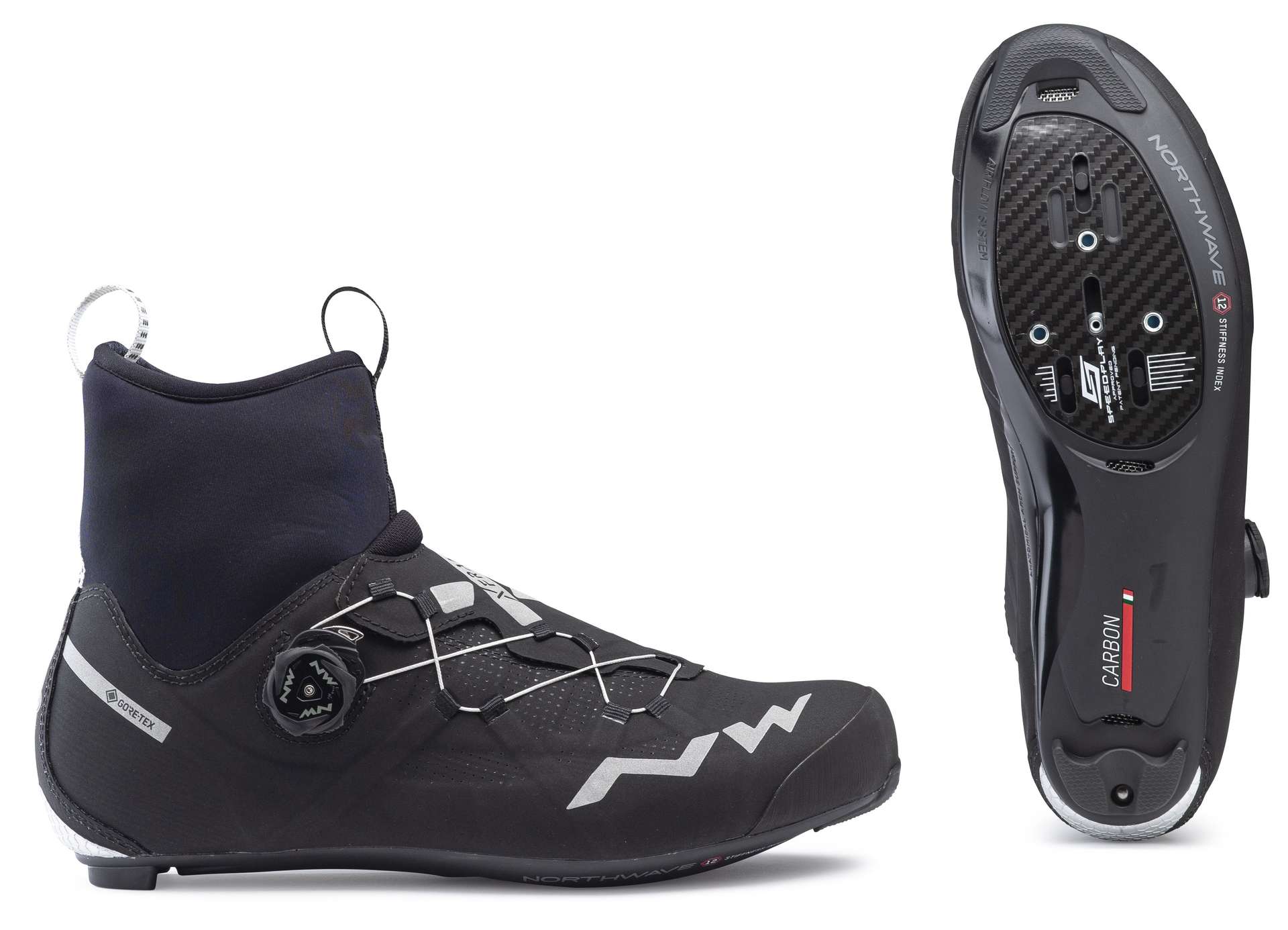 Deze Northwave Extreme R GTX Raceschoenen zijn verhoogde fietsschoenen met een water- en winddicht membraan. De schoenen isoleren zeer goed en houden je voeten zelfs in de koudste omstandigheden lekker warm. De raceschoenen zijn voorzien van een zeer stijve carbon en glasvezel zool met Xframe constructie welke voor een zeer effectieve krachtoverbrenging zorgen. Hierdoor gaat geen enkele watt verloren en direct over op de wielen. De overlap constructie laat alle drukpunten verdwijnen voor een hoog comfort en voorkomt tegelijkertijd tintelen van de voeten. Het SLW2 dial vetersysteem is zeer precies af te stellen tot de perfecte pasvorm en met één beweging los te maken. Of juist beetje bij beetje te openen, om zo de perfecte pasvorm te vinden. Het verhoogde stuk rondom de enkels is gemaakt van isolerend en elastisch neopreen, welke dankzij de GORE-TEX technologie ook water en wind tegen houdt. In combinatie met het vier lagen dikke Arctic GTX voetbed en de isolerende voorvoet zorgt dit voor gegarandeerd warme voeten. Verder hebben de schoenen rondom reflecterende details en een verstevigde neus voor 360 graden zichtbaarheid en meer duurzaamheid.