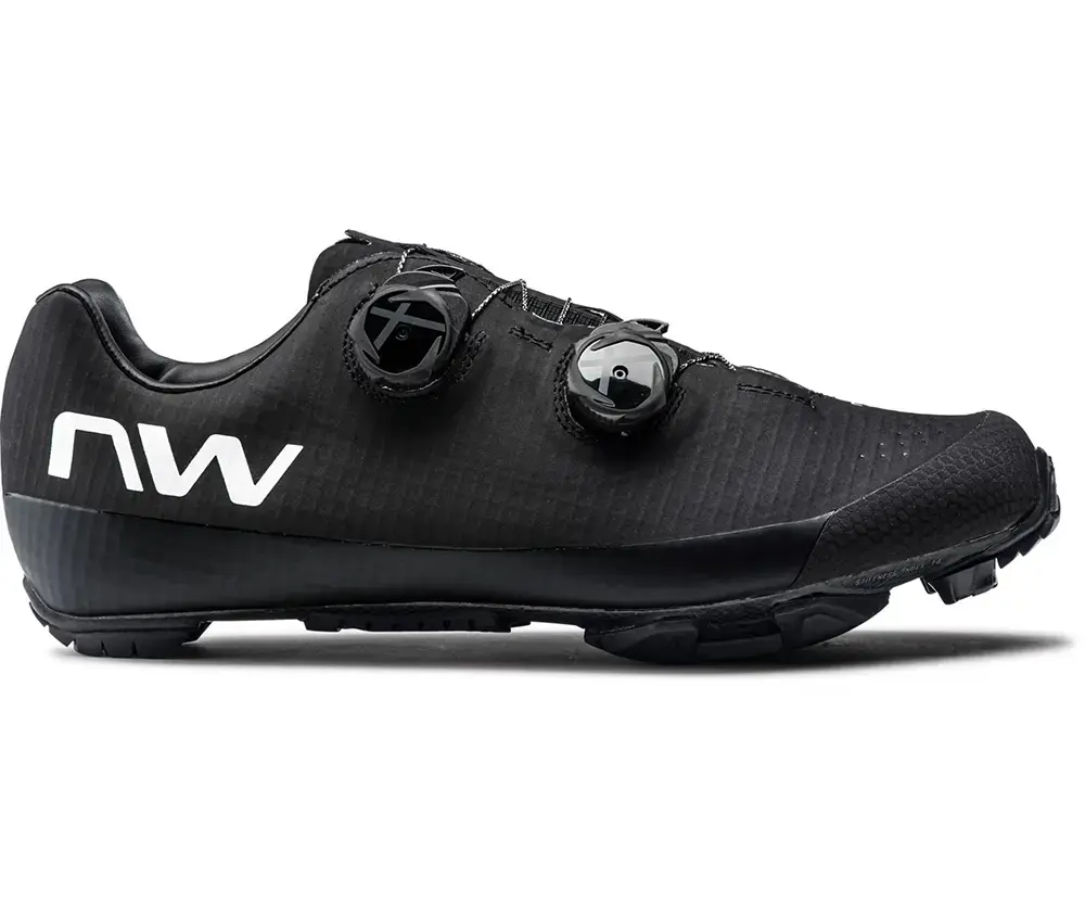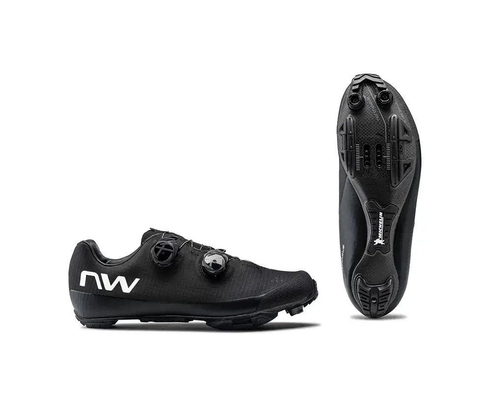Deze Northwave Extreme XC 2 Mountainbikeschoenen zijn perfect voor technische afdalingen en lange beklimmingen. Daardoor worden deze schoenen veel gebruikt door marathon racers. De schoenen zijn comfortabel genoeg voor extreem lange ritten, maar zijn net zo goed te gebruiken op korte, snelle ritten. De extreem lichte zool is volledig gemaakt van carbon. Deze geeft een stijfheid van 14 uit 15. De kracht die je zet wordt dus zeer goed omgezet in voorwaartse snelheid. De dubbele SLW3 sluitingen zorgen dat de schoen perfect aansluit om je voet. Dat wordt versterkt door het ARS systeem welke de voet mooi omsluit zodat alle energie van je voeten wordt doorgegeven aan het pedaal. Daarnaast is het bovenwerk van een slijtvaste stof gemaakt, zodat je je tijdens een heftige rit geen zorgen hoeft te maken over de staat van je schoenen. De mesh inlegzool en het geperforeerde bovenwerk zorgt ervoor dat overtollige warmte weg kan en je voeten op de meest comfortabele temperatuur blijven. De Michelin rubberen delen op de buitenzool bieden zeer veel grip en houden het gewicht laag. De hak van de schoen zorgt dat je voet niet gaat slippen en voorkomt zo blaren.