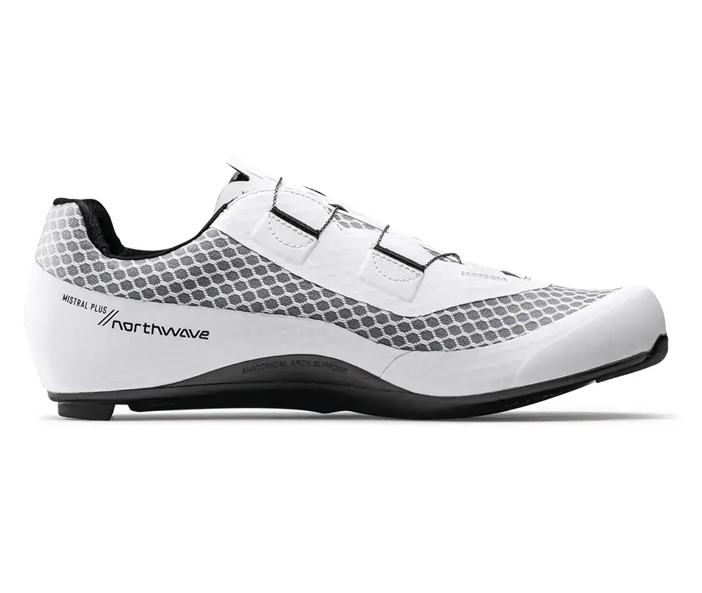 Deze zeer lichte Northwave Mistral Plus wielrenschoen is geschikt voor de professionelere wielrenner. De comfortabele pasvorm in combinatie met een carbon zool zorgt voor een goede overdracht van de energie. Ventilatie van je voeten is verzekerd door de 3D-mesh met zeshoekige cellen. De dubbele rotorsluiting van de schoen zorgt ervoor dat je de schoen perfect gepast op jouw voet aan kunt draaien. Deze is stapsgewijs eenvoudig weer te ontgrendelen. Een geschikte schoen voor lange dagen in het zadel.
