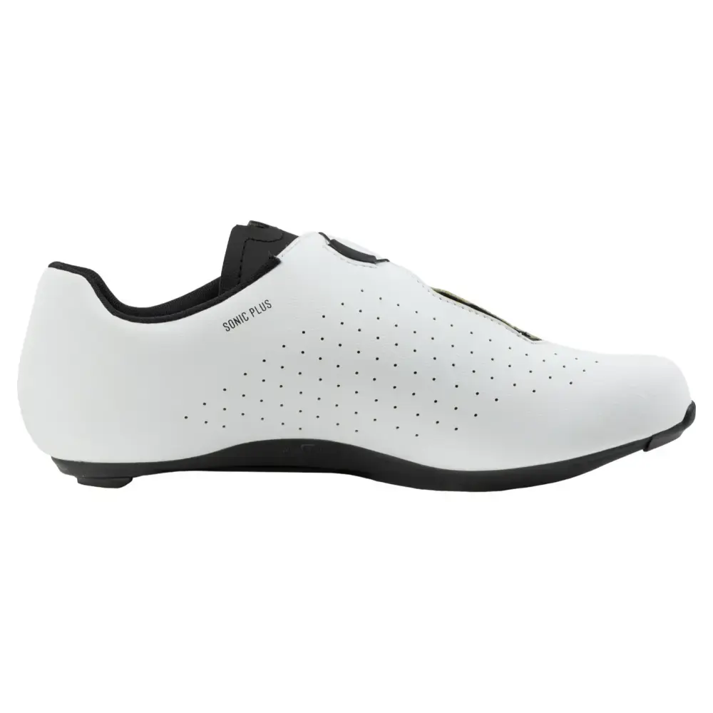 Met Northwave Sonic Plus Wide wielrenschoenen geniet je van een lichtgewicht, maar duurzame constructie die de natuurlijke anatomie van je voet volgt. Het Powershape ontwerp biedt uitstekende ondersteuning, met name in het gebied rond de voetboog, terwijl twee ventilatieopeningen in de zool zorgen voor optimale luchtstroom en thermoregulatie. Het X-Dial SLW3 sluitingsysteem zorgt voor micrometrische aanpassingen en een vorm die past als een handschoen, zonder drukpunten. Met een gewicht van slechts 260 gram (maat 43) zijn deze schoenen ideaal voor zowel training als wedstrijd.