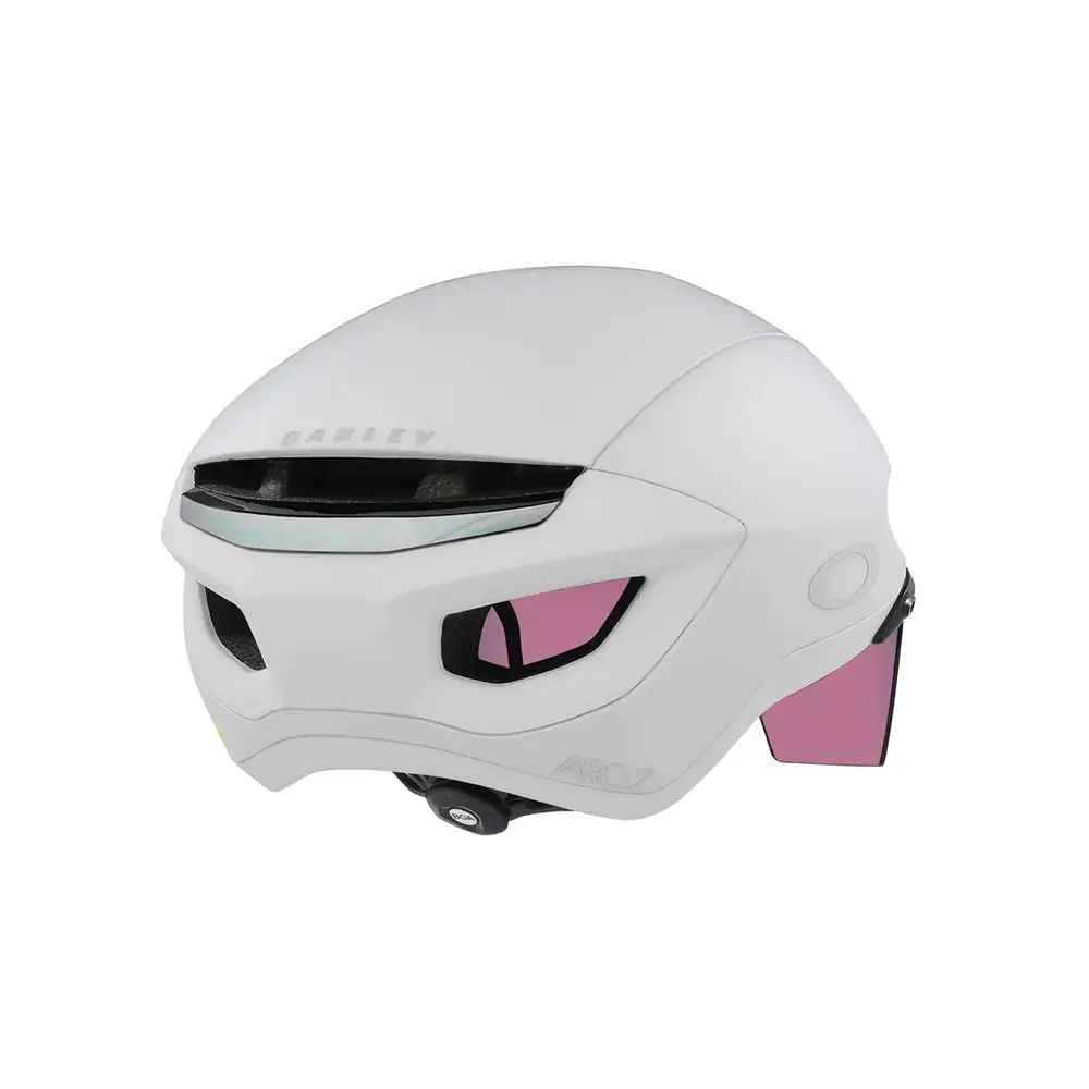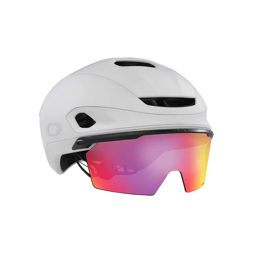 Met de ARO7 Race Fietshelm komt Oakley met een aerodynamische helm die voornamelijk voor tijdrijders en triatleten geschikt is. De helm is ontwikkeld met profrenners en triatleten en van erg goede kwaliteit. De helm is super veilig dankzij de stevige Polycarbonaat shell en het zeer goed beschermende EPS schuim. Bij een eventuele impact zal jouw hoofd dan ook altijd van een goede bescherming profiteren. Opvallend aan de helm is het BOA sluitsysteem achterop wat normaliter alleen voor schoenen gebruikt wordt. De helm wordt geleverd met een Prizm Road vizier. Deze draagt bij aan een beter zichtveld, waarbij kleuren meer helder worden en je veranderingen in de textuur van de ondergrond gemakkelijker waarneemt. Ook handig: de kinband sluit magnetisch, zodat je tijd bespaart tijdens een triatlon.