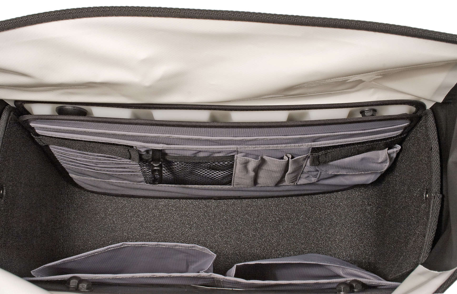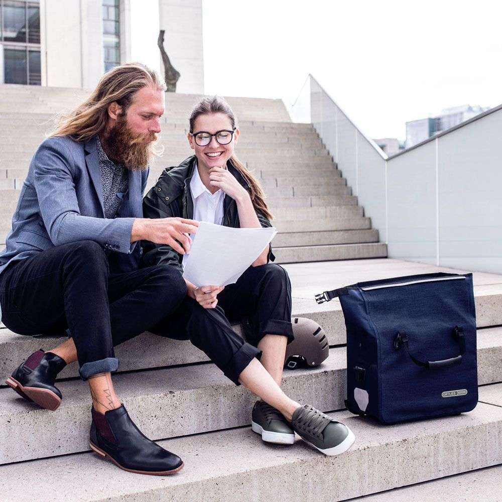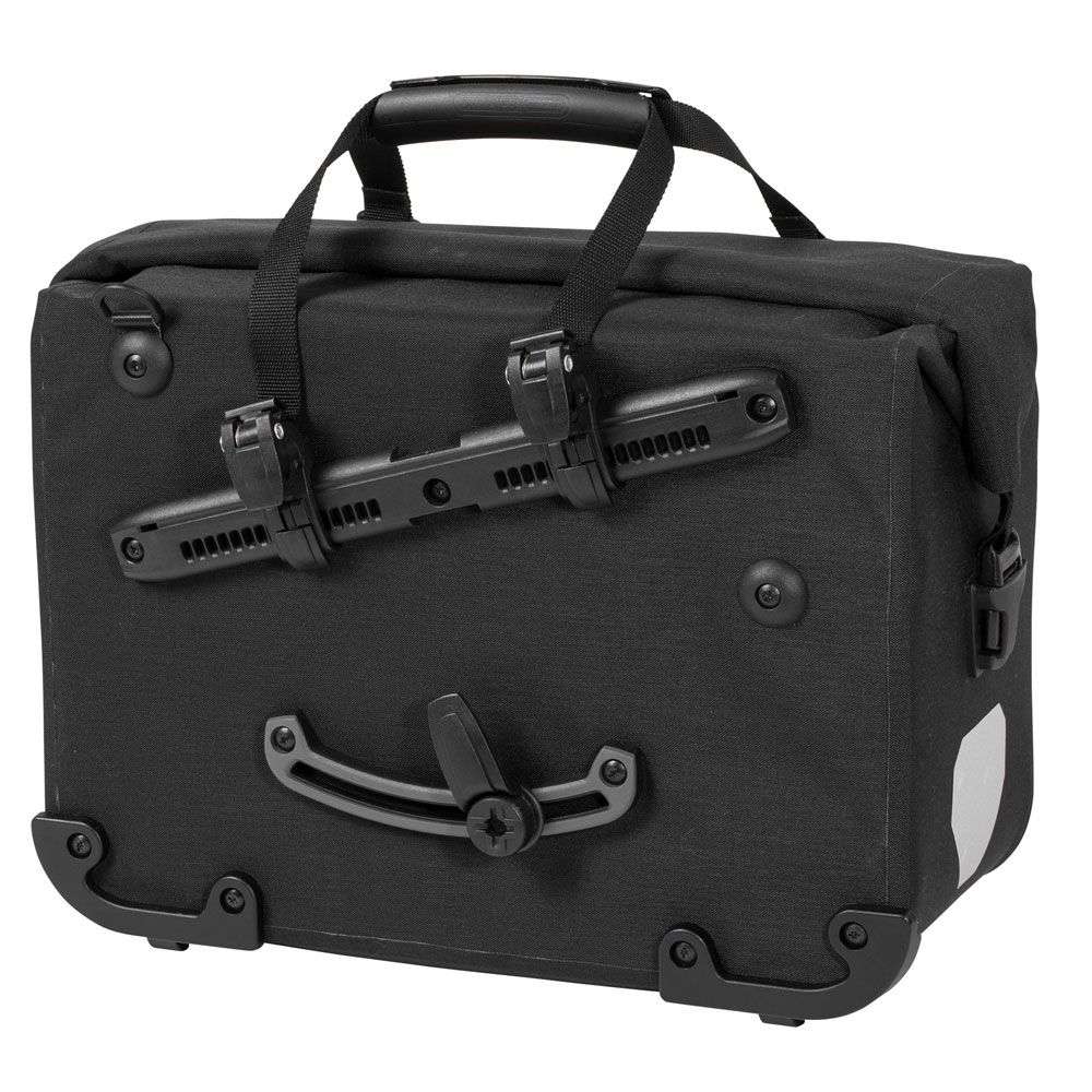 Deze waterdichte ORTLIEB Office-Bag fietsaktentas met rolsluiting kan zowel rechts als links aan de bagagedrager gehangen worden en kan met één hand eenvoudig en snel op de bagagedrager bevestigd worden. De Office Bag biedt voldoende ruimte voor twee DIN A4 Ordners, schrijfgerei en overige kantoorbenodigdheden. Met de gepolsterde notebook insert (verkrijgbaar als optioneel accessoire) is deze tas een perfecte Notebook tas (tot 15.4 inch). Twee grote 3M Scotchlite reflectoren en een reflecterend ORTLIEB logo( met uitzondering van de zilveren versie) zorgen voor goede zichtbaarheid in slechte weersomstandigheden en in het donker.