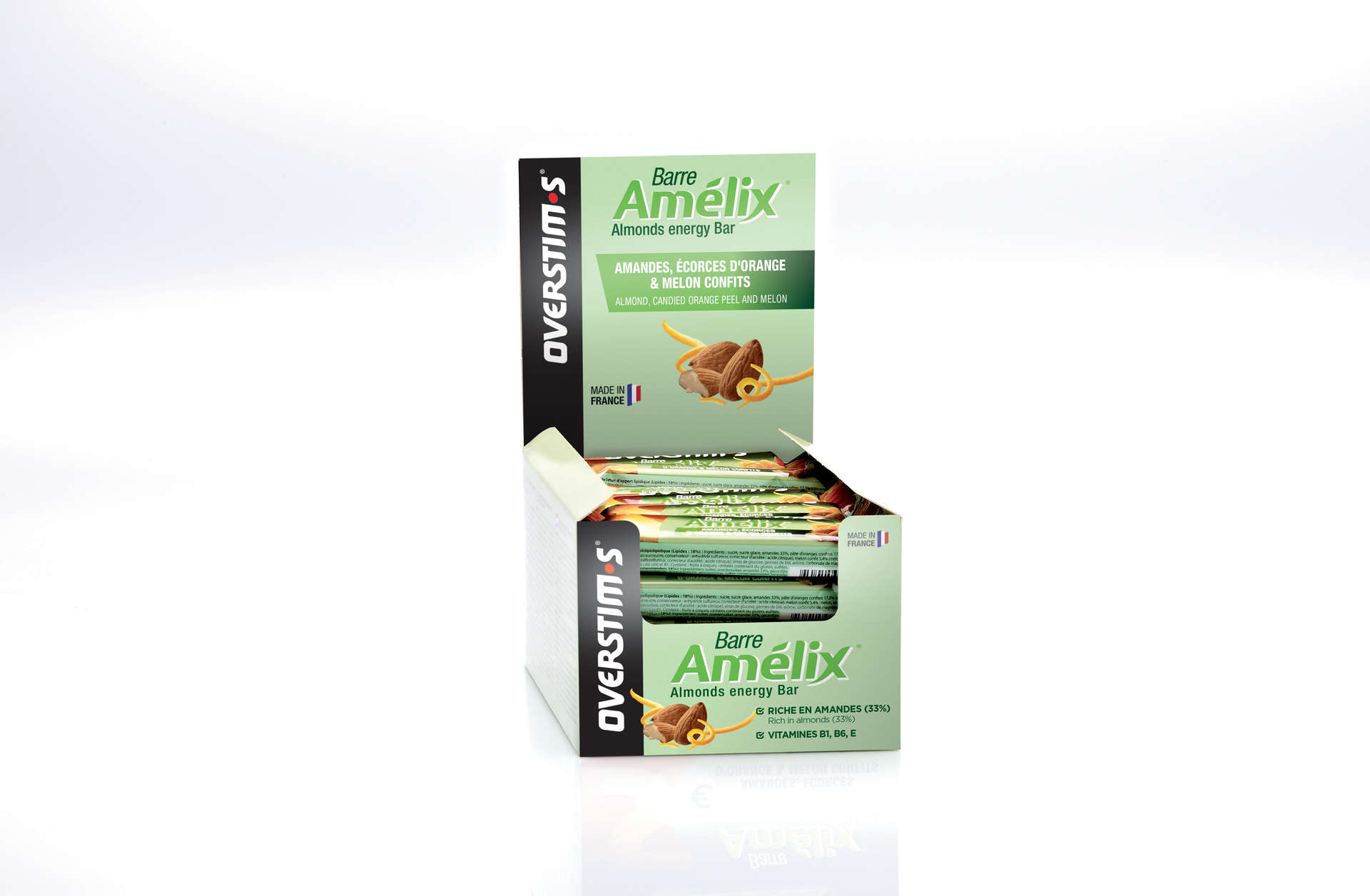 Met deze OVERSTIM.s Amelix Sportrepen ben je er zo weer bovenop! De reep heeft een hoge energetische waarde en voorziet je van een grote hoeveelheid amandelen. Niet alleen leveren deze veel energie maar ook gezonde vetten! Maar liefst 33% amandelen bevatten deze repen. De repen hebben een zachte structuur, waardoor deze gemakkelijk tijdens de inspanning gegeten kan worden. De reep geeft ook lange energie doordat er naast koolhydraten ook vetten en eiwitten in deze repen zitten, welke de opname iets vertragen maar op langere termijn ook energie geven. Kortom ga jij op een zwaar trainingsweekend waarbij het weer niet altijd mee zal zitten? Dan zijn deze repen echt iets voor jou!