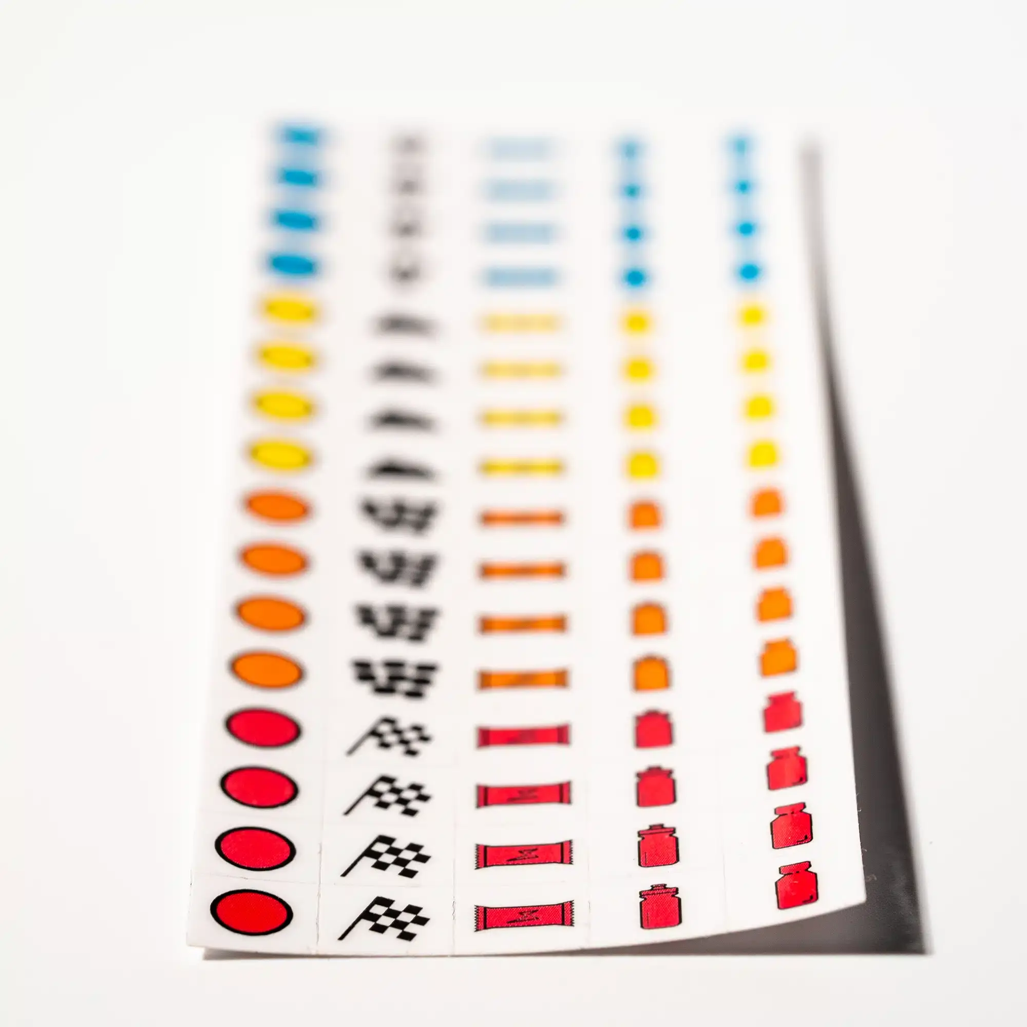 - Bevat 1 set van: 5x blanco sticker, 2x stickervel met symbooltjes, 1x logo sticker
