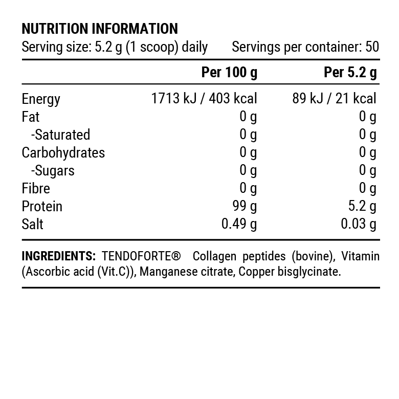 IngrediëntenGehydrolyseerd rundercollageen (TENDOFORTE®), vitamine C (L-ascorbinezuur), mangaancitraat, koperbisglycinaat.
