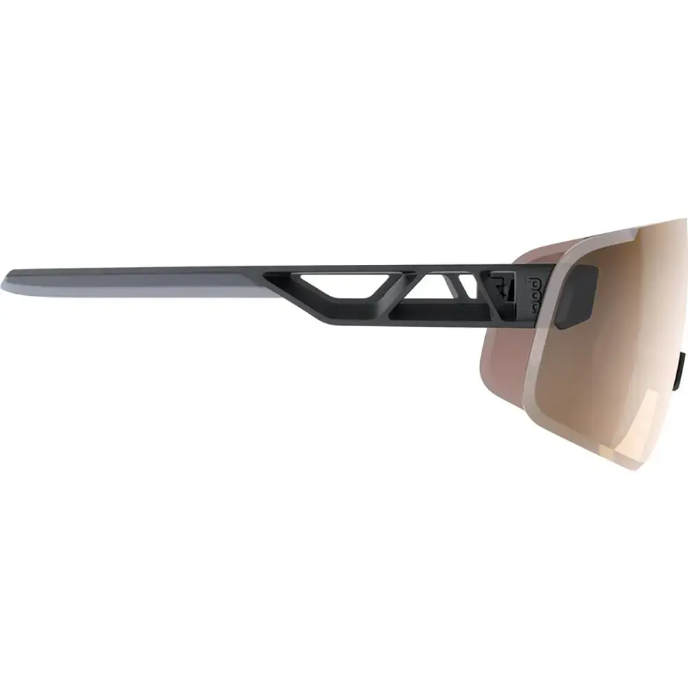 Deze POC Elicit Toric Sport Zonnebril biedt een frameloos ontwerp met een doorlopende enkele lens voor een uitzonderlijke dekking en tevens een extra licht montuur. Door delen van het montuur open te laten wordt een minimaal aan materiaal gebruikt, waardoor gewicht wordt bespaard. De speciale pootjes breken niet af tijdens een val, maar vallen er wel af, waarna je ze gemakkelijk weer kan monteren. Het montuur is gemaakt van een nieuw materiaal genaamd ‘biogrilamid’. Net zo licht en sterk als het bekend grilamid, maar nu grotendeels gemaakt van gerecyclede materialen voor een lagere impact op het milieu. Alle brillen binnen deze serie zijn voorzien van Clarity lenzen, welke contrast verhogend werken, waardoor details in de weg beter zichtbaar worden. Ook zijn de lenzen voorzien van RiPel anti-vuil en water behandeling en beschikken ze over een anti-kras laag. Ook zijn de lenzen gemakkelijk verwisselbaar en worden de brillen geleverd met een extra transparante lens. Voor een optimale pasvorm zijn de pootjes verstelbaar en het neusstuk vervangbaar. Deze zonnebril wordt geleverd met een Trail Zilver lens, welke binnen categorie 2 valt en dus perfect is voor heldere dagen.