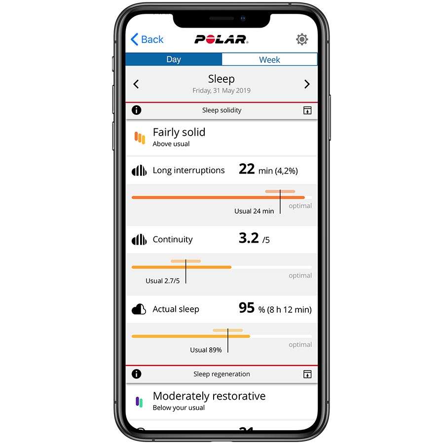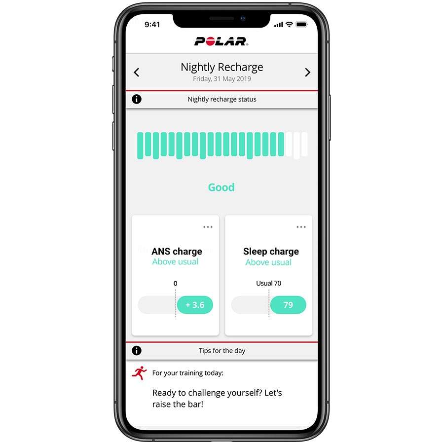 • Toont je slaapduur, slaapkwaliteit, AZS-herstel, hartslagvariabiliteit, gemiddelde