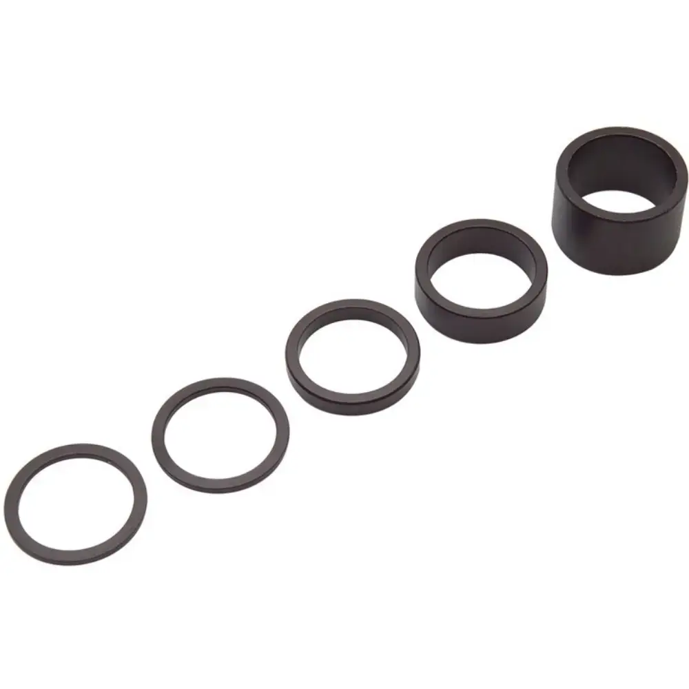 De Pro Spacers set bestaat uit 5 verschillende maten spacers voor een stuurbuis met een maat van 1-1/8” (28.6mm). De maten van de spacers zijn 2, 2, 5, 10 en 20 mm en wegen slechts 12 gram. De mooie glanzende zwarte look maakt je fiets helemaal af.