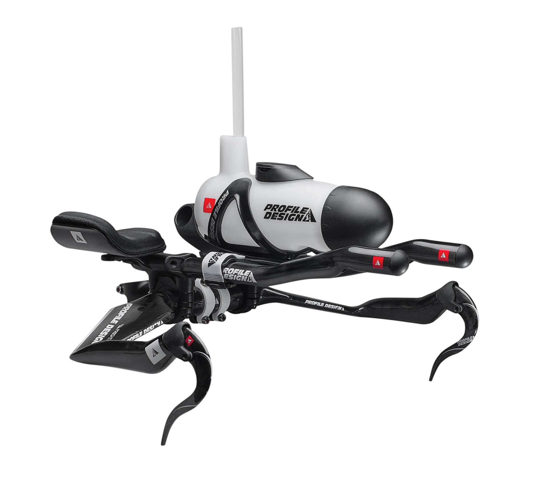Het Profile Design HC Drinksysteem bestaat uit een houder die je op je de armsteunen van je tijdritstuur monteert met daarin een drinkfles geklemd. Deze drinkfles heeft een opening aan de bovenzijde waar een ritje ingestoken kan worden. In fietspositie ligt de drinkfles tussen je armen en kun dus zonder enige noemenswaardige inspanning drinken tijdens het fietsen. Wordt gebruikt door diverse wereldkampioenen in de triathlonsport.