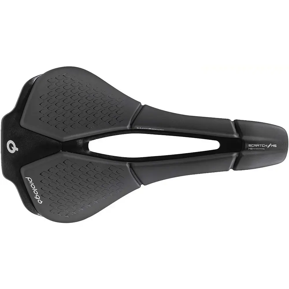 Dit is het zadel van Tour de France winnaar Tadej Pogacar! Bij de nieuwe Scratch M5 zadels van Prologo wordt gebruik gemaakt van de 4.0 technologieën waarmee de zadels erg innovatief zijn wat betreft afmeting, vorm en ergonomie. Deze zadels zijn daarmee erg geschikt voor zowel road als off-road gebruik en daarmee dus ook voor tijdrijden en triatlon. Dankzij de innovatieve T-vorm is de Scratch M5 geschikt voor zowel heren als dames. Het nieuwe MSS (Multi Sector System) is ontwikkeld in samenwerking met de technische universiteit van Milaan en verbetert comfort en prestaties. Het actieve schuim is verdeeld in 5 verschillende zones die onafhankelijk van elkaar bewegen. Hiermee worden de natuurlijke bewegingen tijdens het trappen ondersteund bij zowel de duw- als de trekfase. De afgeronde vorm van het zadel maakt dat de heupen op een natuurlijke wijze kunnen roteren voor een optimale stabiliteit en ondersteuning. Ook zorgt de vorm voor een betere gewichtsverdeling over een groter oppervlak. De 7mm rails zijn vervaardigd van T-Irox materiaal. Dit materiaal is erg licht, sterk en goed bestand tegen torsie. Zo gaat er minder energie verloren die richting je pedalen zou moeten gaan. Niet voor niets is dit materiaal afkomstig uit de aerospace industrie. Dit zadel maakt gebruik van het Prologo PAS systeem. Dit open kanaal bevordert de bloedcirculatie en elimineert drukpunten of doofheid van de edele delen. Het zadel is hiermee uitermate comfortabel en geschikt voor langere ritten.