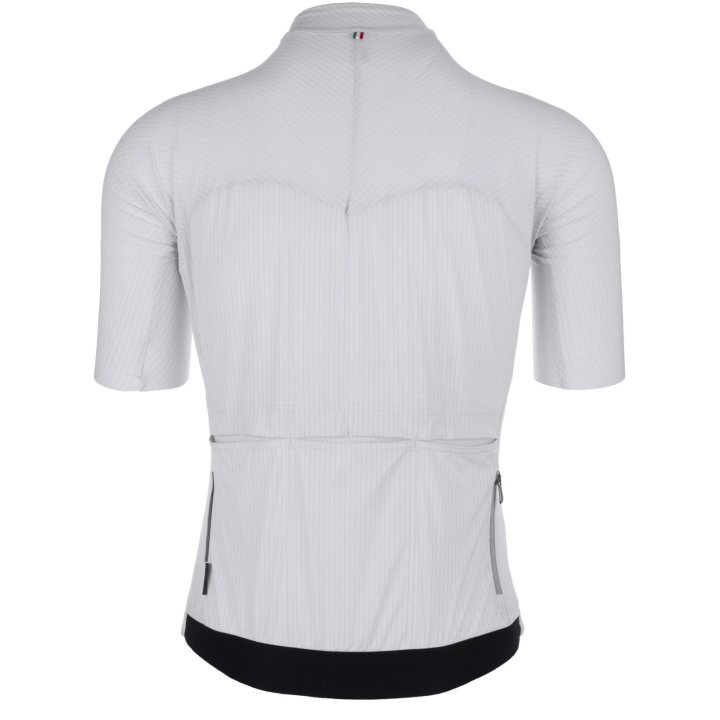 Het Q36.5 Dottore PRO fietsshirt is van absolute topkwaliteit en deels gemaakt van echt zilver! Dit zilverdraad geleid heel goed, waardoor warmte van het lichaam snel kan worden weggenomen en overgedragen aan de lucht. Daarnaast heeft het zilver een antibacteriële werking en houdt het ‘electrosmog’ buiten. Op de achterzijde van het shirt zitten drie insteekzakken die bijna onzichtbaar zijn. Waar veel shirt de zakken op de achterzijde genaaid hebben, zitten die hier aan de binnenkant van het shirt. Hierdoor blijven je spullen steviger in het shirt zitten en geeft dit een aerodynamisch voordeel. De lichtgewicht stof zelf is zeer slijtvast en sluit perfect aan om het lichaam. De stof voert zweet 50% sneller af dan zijn voorganger. Door de extreem fijne weving is ook het ademend vermogen ook verhoogd, waardoor je op warme dagen ook op temperatuur blijft.