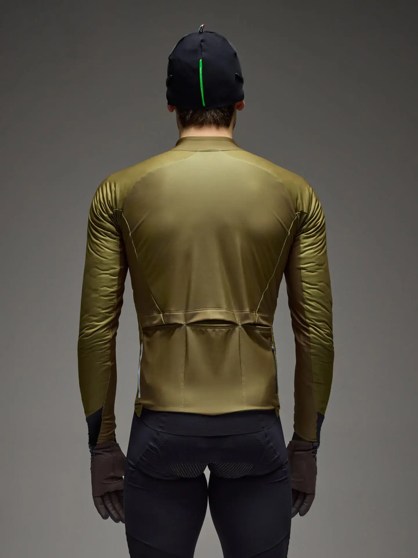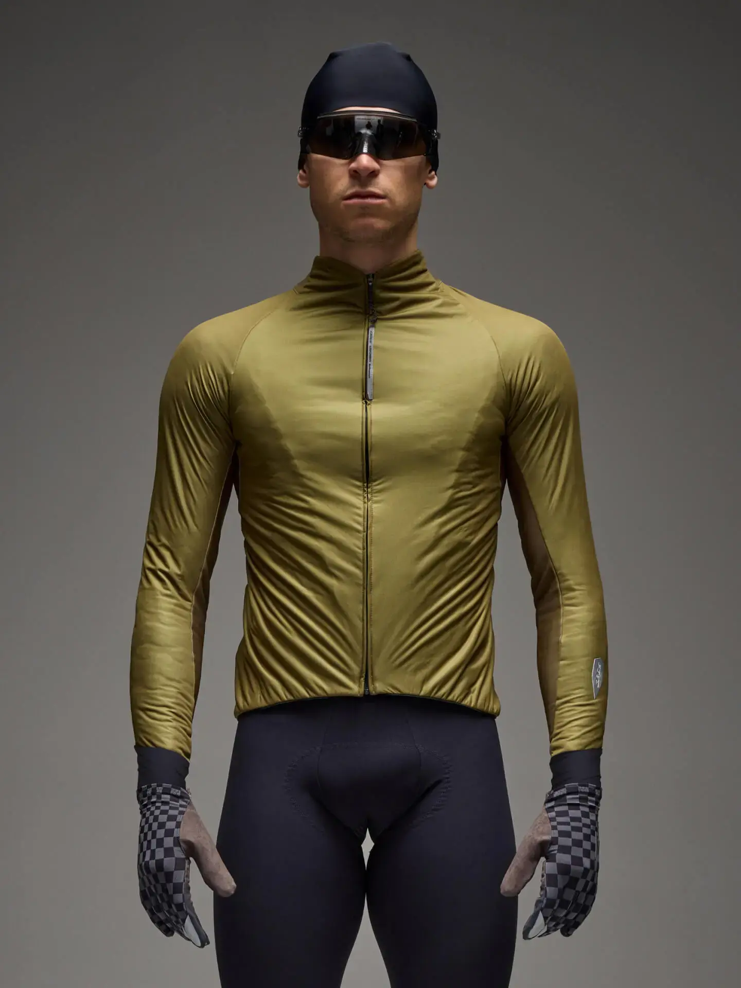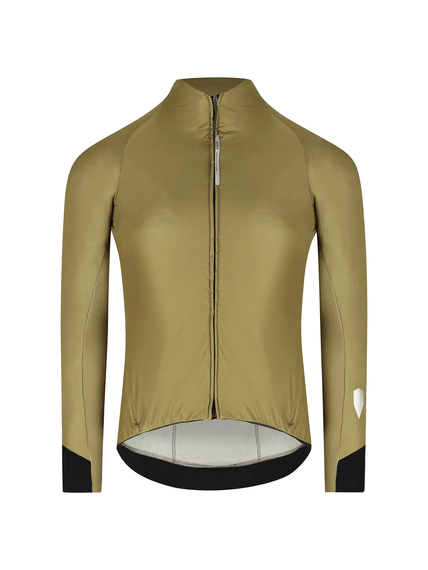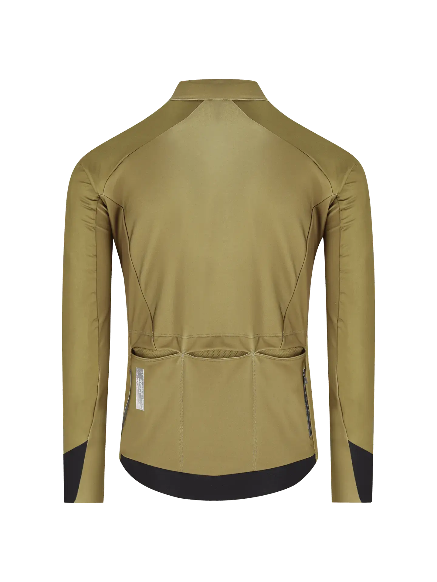 De onderarmen, oksels en rug zijn gemaakt van een dichtgebreide microfleece, behandeld met een DWR-coating voor waterafstotendheid. De hermetische kraagconstructie zorgt ervoor dat je lichaamswarmte behouden blijft, zelfs bij harde wind. Dankzij de body mapping constructie sluit het jack nauw aan op het lichaam voor betere warmte- en vochtregulatie, maar biedt het toch voldoende ruimte om een basislaag en een lange mouw fietsshirt te dragen bij extra koude ritten.