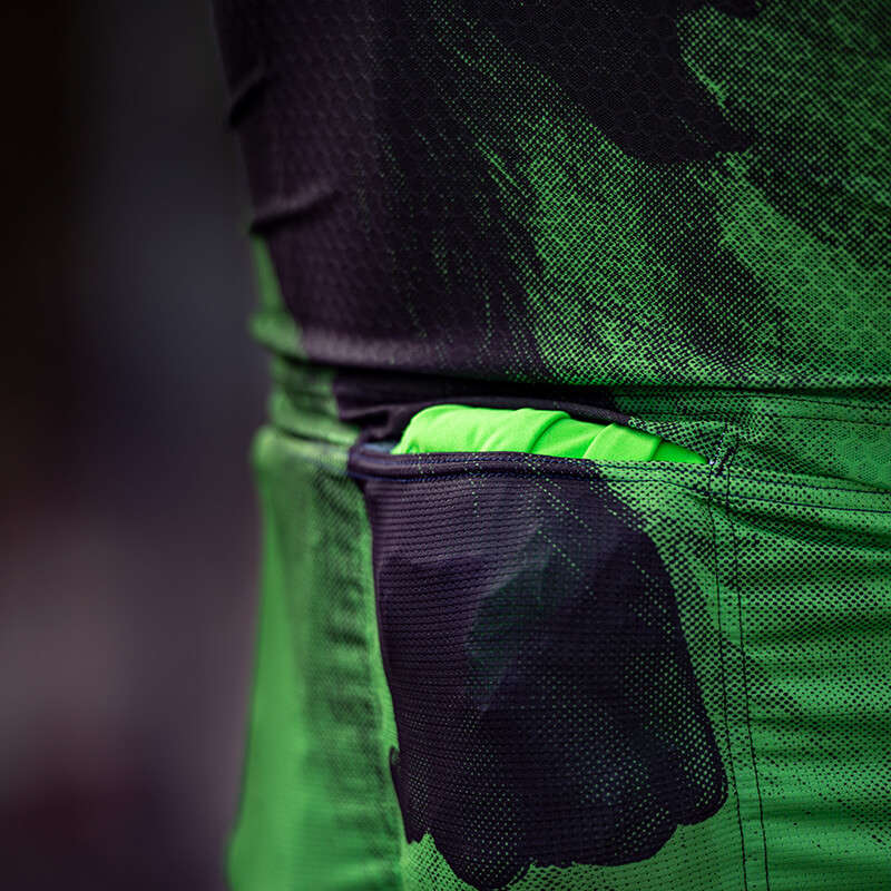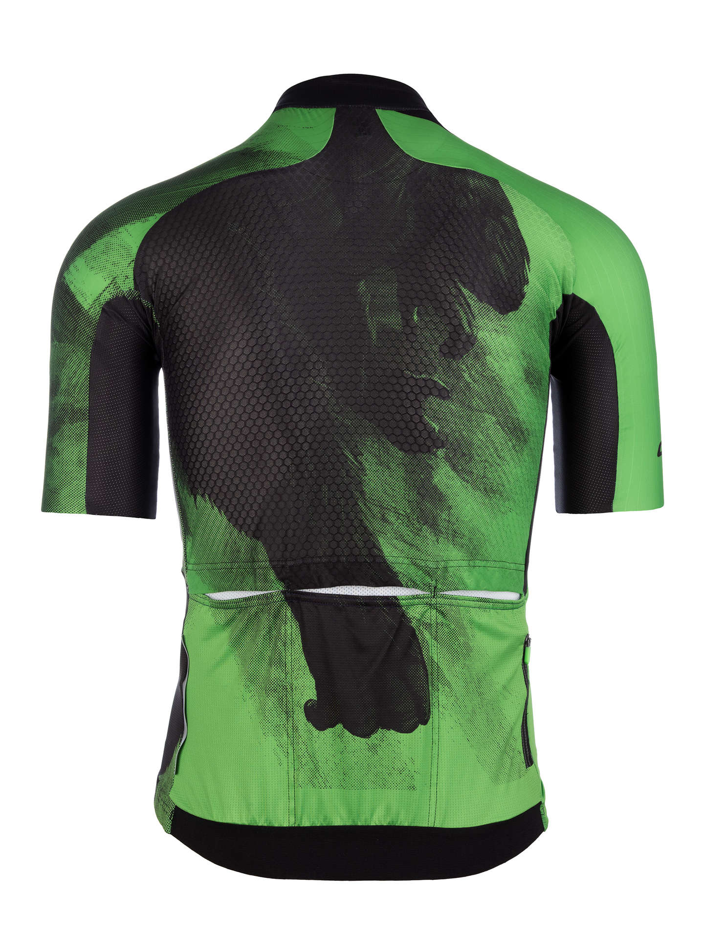 Het Q36.5 R2 Gorilla fietsshirt zorgt dankzij het ontwerp met aanvallende Gorilla dat je zeker zult opvallen tijdens je fietsrit! De mouwen zijn licht geribbeld, dit wordt Raglan genoemd. Hierdoor kan de wind makkelijk over de stof heen, dit is dus een aerodynamisch voordeel. De voorzijde van het shirt is gemaakt van een micro-geperforeerde stof, wat een hoog ademend vermogen heeft. De achterzijde is van een mesh in de vorm van een honingraad. Dit is stevig, maar vooral ook erg licht. Daardoor heeft het shirt een gewicht van slecht 110 gram in maat M. Ondanks die dunne stof, beschermt het shirt je tegen de zon met een hoge UV-bescherming.