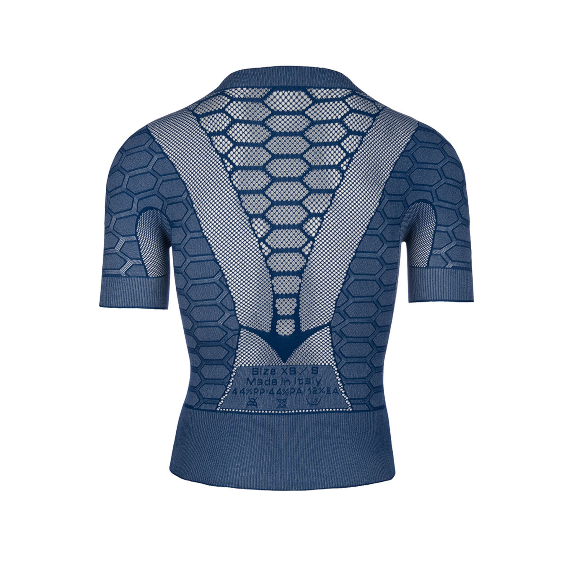 Het Two Ondershirt van Q36.5 is ontwikkeld voor intensief sporten in de lente, herfst en vroege zomer. Het breiwerk, dan bijna naadloos is, biedt een ongekend draagcomfort. Het materiaal is lichtgewicht en scheur- en slijtvast. Het honingraatmotief met open mesh-stukken, reguleert lichaamswarmte vanaf zo’n 15 graden en voert zweer effectief af van de huid.