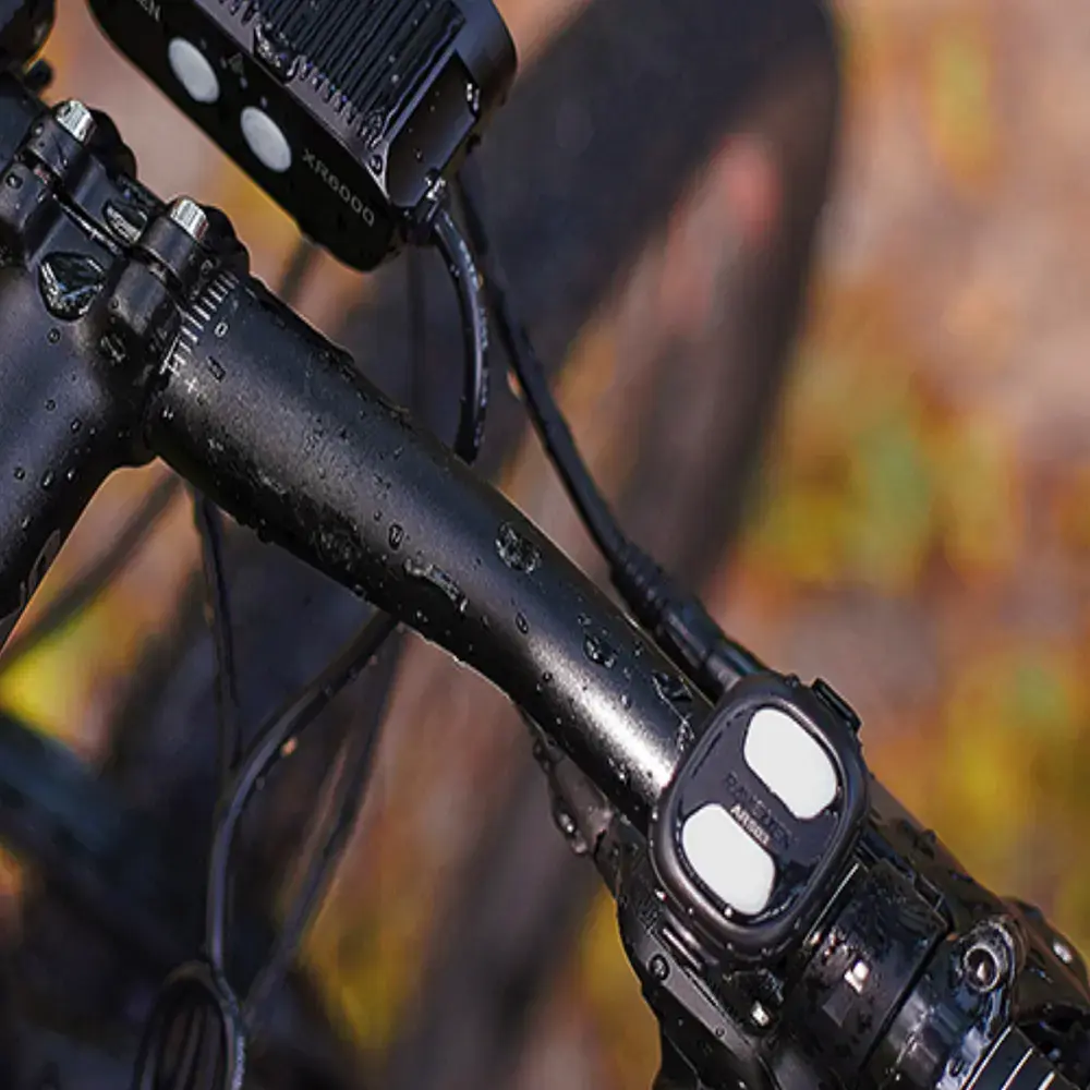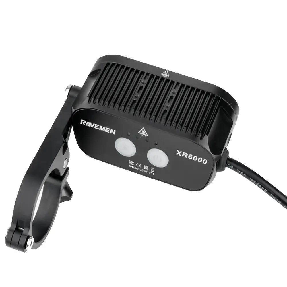 De Ravemen XR6000 is met zijn 6000 lumen een van de krachtigste lampen op de markt. Bij deze lamp is overal aan gedacht. Je krijgt een brede straal dichtbij de lamp en een smalle straal voor in de verte. Dit zogeheten HiLo beam systeem zorgt voor perfect zicht zonder tegenliggers te verblinden. De lamp is erg sterk en is ook waterdicht. De lamp heeft een losse afstandsbediening waarmee je de lichtstanden regelt. Deze controller is om je stuur te bevestigen zodat je er snel en eenvoudig bij kan. De lamp heeft een losse accu welke je op je frame kunt monteren. Hiermee kan je tevens middels een USB-C aansluiting je smartphone of ander device opladen. De lamp heeft een zeer sterke behuizing met extra koelvinnen op de bovenzijde, waardoor deze nooit te heet zal worden. Dankzij het interne geheugen zal de lamp bij het aanzetten de laatst gebruikte modus tonen. Ook beschikt de lamp over een dagrij knipper modus.