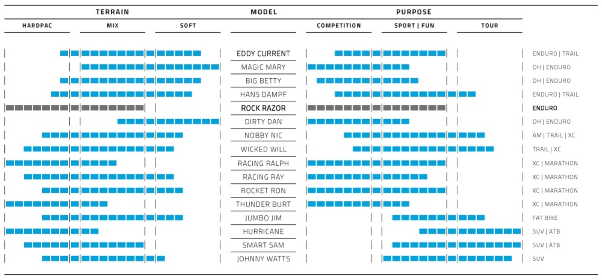 De Rock Razor van Schwalbe is een Semi-Slick band die uitermate geschikt is voor harde ondergronden en snelle trails. Het loopvlak heeft wel noppen, maar die zijn laag en rollen zeer soepel. Bovendien geven deze voornamelijk op harde ondergronden veel grip. Op de schouders van de band zitten hogere noppen voor de nodige grip in bochten. De band is door de lage rolweerstand ook uitermate goed als achterband te gebruiken.