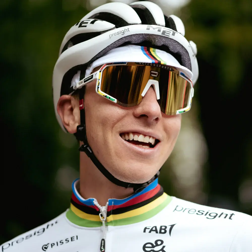 - In de regenboogkleuren van wereldkampioen Tadej Pogačar