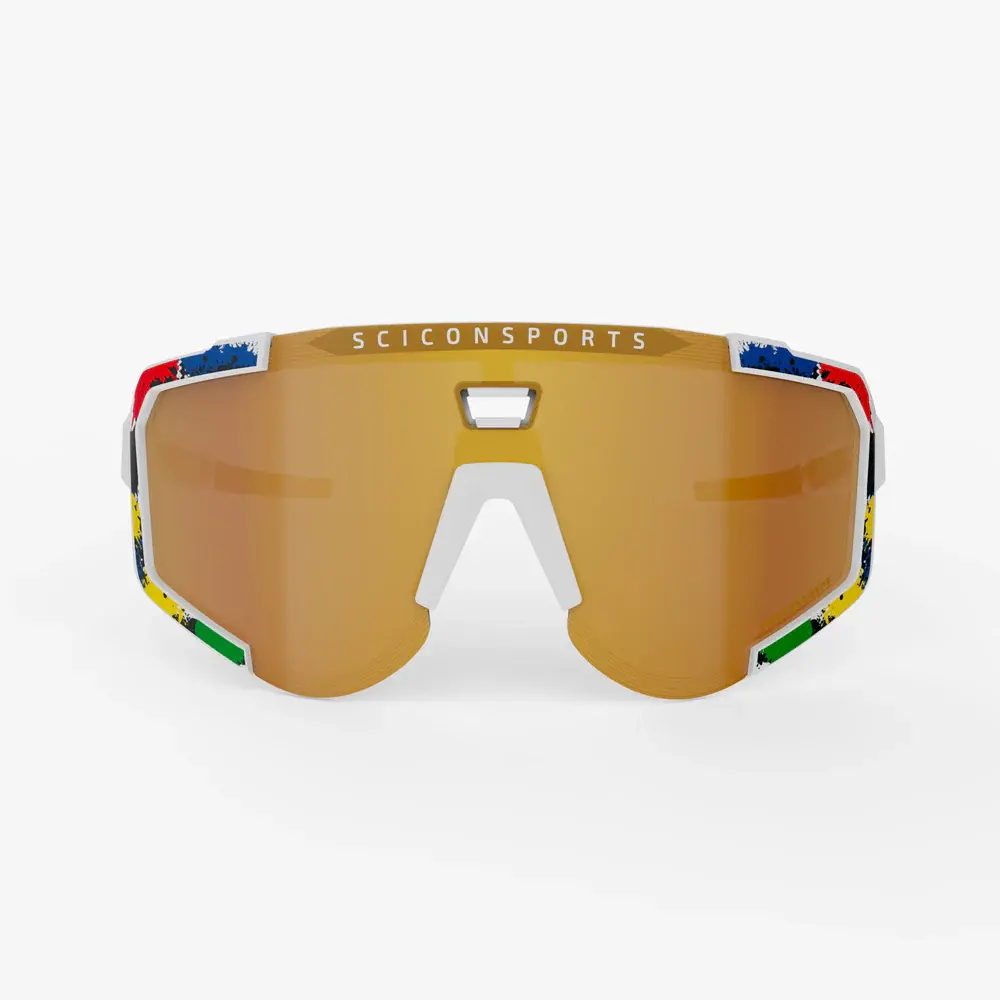 De Scicon Aeroscope zonnebril World Champion editie is een hommage aan wereldkampioen Tadej Pogačar. De bril tilt sportprestaties naar een hoger niveau met een design dat precisie, comfort en duurzaamheid naadloos combineert. Deze bril is ontworpen om jouw prestaties te optimaliseren, terwijl hij je een kristalhelder zicht biedt. De pasvorm is perfect afgestemd op de contouren van je gezicht en de neussteuntjes zijn in de hoogte verstelbaar, zodat je altijd verzekerd bent van maximaal draagcomfort. Daarnaast zijn de pootjes ook los te verstellen. De lens van deze bril heeft een lichtdoorlatendheid van 17%, wat hem erg geschikt maakt voor zonnige dagen. Eventueel regenwater loopt meteen van de lens af dankzij de oleo- en hydrofobe coating zodat je ook tijdens een bui goed zicht houdt.