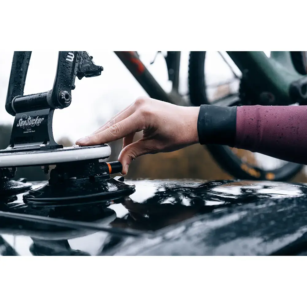 Unieke, zeer veilige en stabiele SeaSucker Talon QR Fietsendrager voor 1 fiets met vacuüm zuignappen gebaseerd op het systeem uit de glasindustrie! De fietsendrager is voorzien van 4 zeer sterke zuignappen en maakt hem daardoor geschikt voor één fiets tot 18 kilo. Je monteert je MTB of racefiets door de voorvork te monteren aan de houder met een steekas bevestiging. Steekasmontage is mogelijk door middel van (niet meegeleverd) Huske pluggen. Ook voor een Quick release montage moet je een QR adapter bij bestellen. Het achterwiel wordt vastgehouden door de vierde zuignap, op de achterzijde of achterruit van de auto. De zuignappen zijn voorzien van een vacuüm pomp met indicator. Dat maakt deze fietsendrager geschikt voor ieder deel van de auto: dak, ruit of kofferbak! Het voorwiel dient men in de auto te vervoeren, óf op het dak te bevestigen met de SeaSucker Add-On Voorwiel Houder. De Talon is na het vervoeren eenvoudig te demonteren en laat géén sporen achter op de auto.
