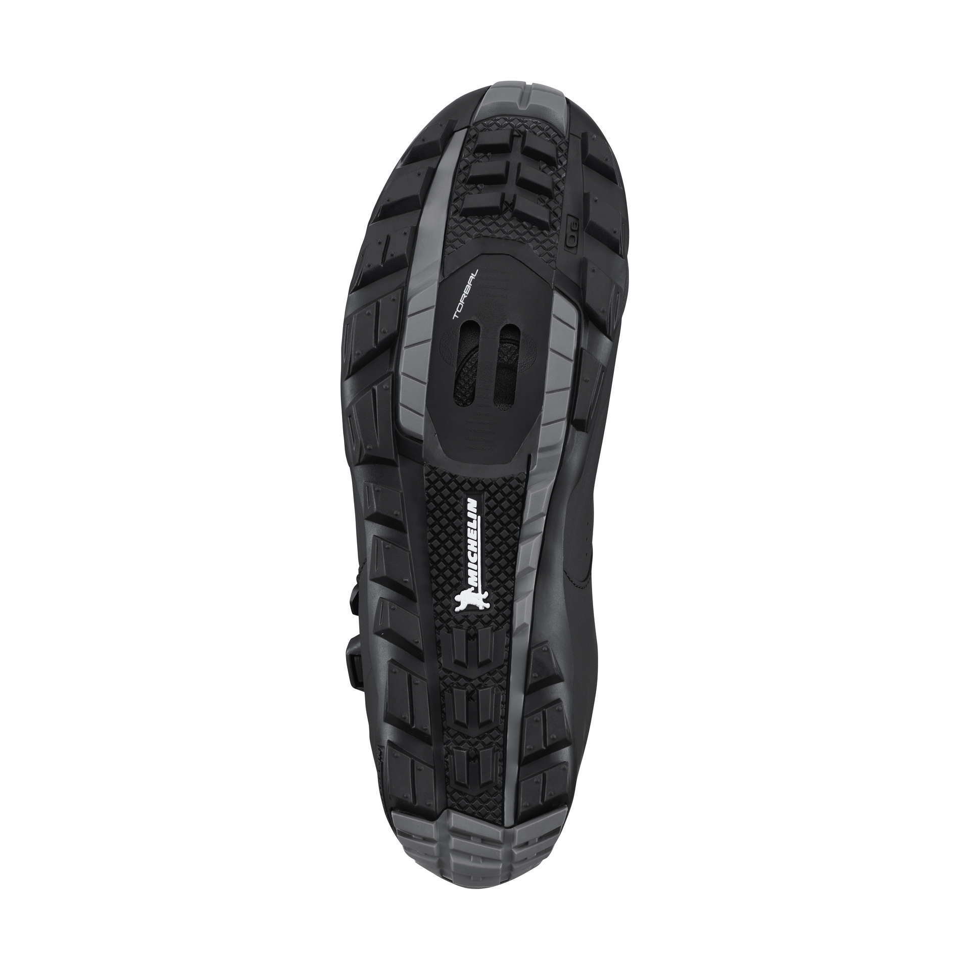 De Shimano ME702 Enduro Mountainbikeschoenen zijn van topkwaliteit en bieden ongeëvenaarde duurzaamheid, stabiliteit en grip. De zool is namelijk gemaakt van rubber van bandenfabrikant Michelin. De sluiting is low-profile en daardoor uitermate geschikt voor trailrijders en downhillers. De sluiting kan namelijk wel tegen een stootje. De geperforeerde, synthetisch lederen bovenkant optimaliseert het comfort, sluit mooi aan om de voet en geeft een hoog ademend vermogen. Bij de hak is een enkelbescherming aangebracht van neopreen die bescherming biedt tegen opspattend vuil en water van de trails. De zool van de schoen is waterdicht gemaakt om die waterdichtheid te versterken. De tussenzool bevat de “TORBAL-technologie” en zorgt daardoor voor een natuurlijke ‘flow’ van de rijder tijdens de afdalingen. De pasvorm is vrij breed, volgens Volume+ model. Daardoor heeft de leest extra ruimte voor de tenen. Dit zorgt voor extra comfort voor een breed scala aan voetvormen zonder dat het invloed heeft op de lengte van de schoen.
