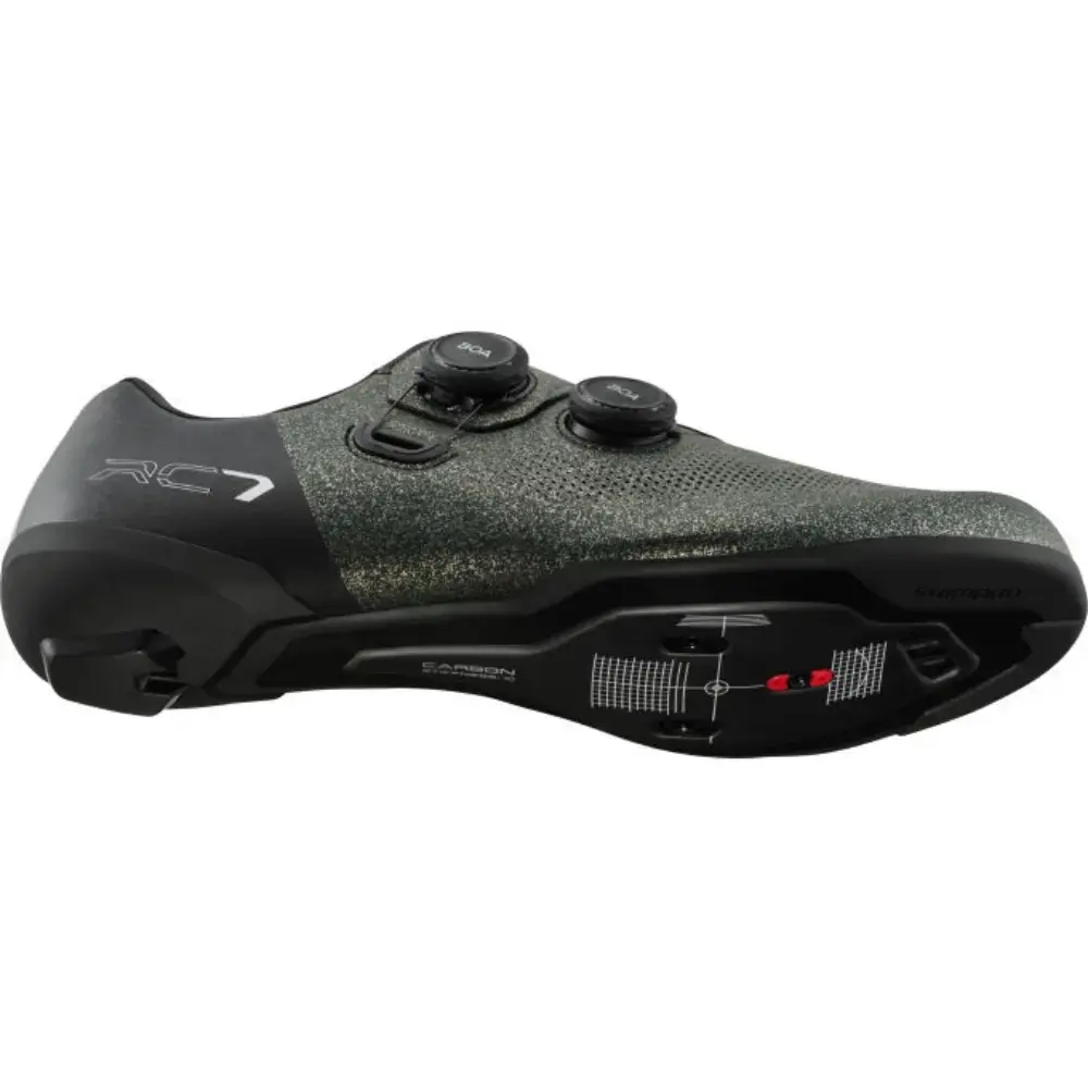De Shimano RC703 Wielrenschoenen zijn voorzien van een stijve carbon tussenzool voor super goede krachtoverdracht op je pedalen. De geïntegreerde naadloze tussenzool en bovenconstructie zorgen voor een nieuw niveau van pasvorm, stabiliteit en lichtgewicht prestaties. Dit vernieuwde model heeft niet een, maar twee BOA L6Z sluitingen. Het soepele, synthetische leer met perforatie zit comfortabel en heeft een hoog ademend vermogen. De Shimano Dynalast technologie bevordert soepeler trappen en zorgt voor een efficiëntere krachtoverbrenging.