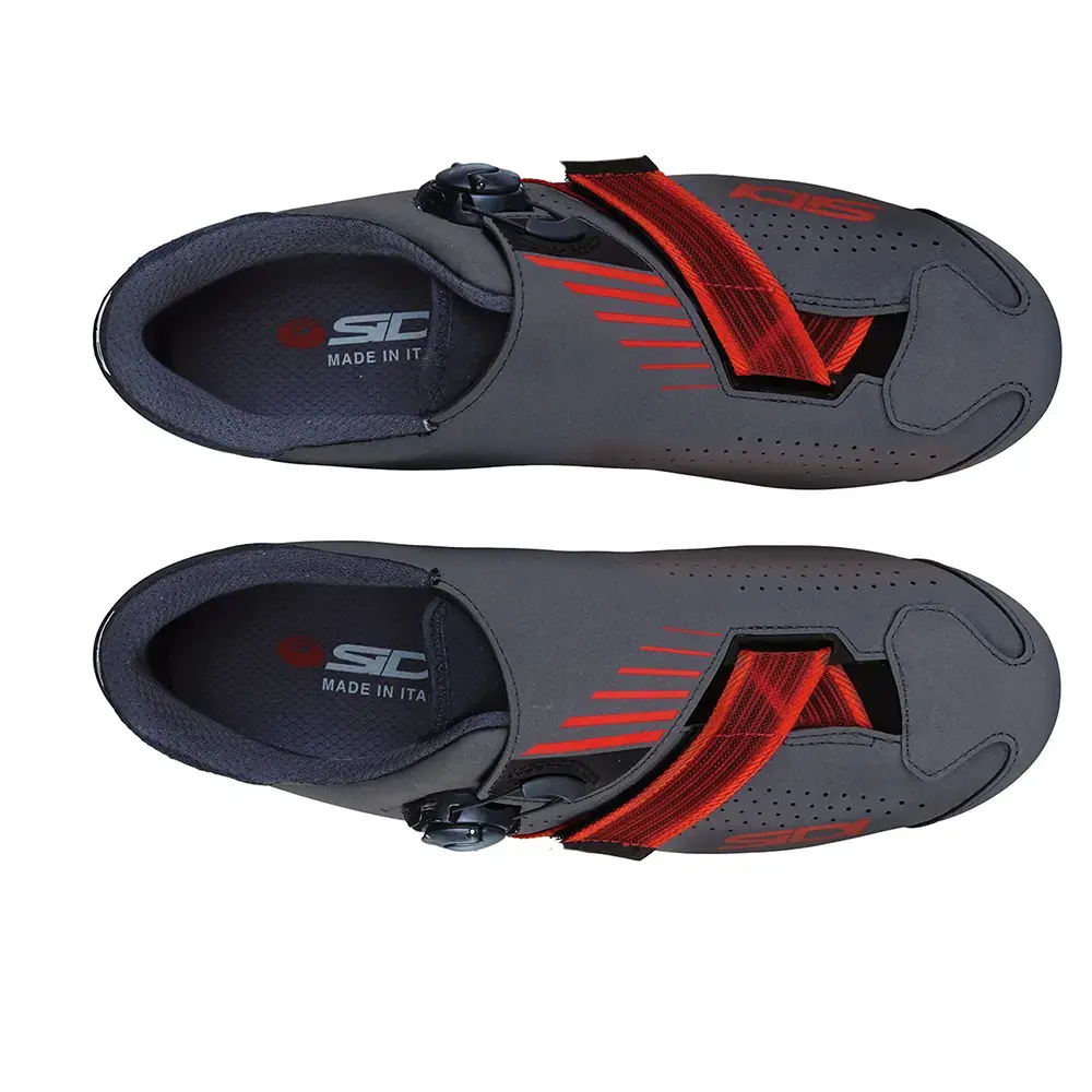 De Aertis MTB-schoen van Sidi maakt je rit comfortabeler en prettiger dankzij de ongeƫvenaarde stabiliteit die de schoen biedt. De snelheid op de pedalen verkrijg je onder andere door de MTB SR17 zool, die bestaat uit nylon met kunststof inserts voor maximale stabiliteit. Mocht je van de fiets moeten in modderige omstandigheden, dan geven de noppen voor de grip die je nodig hebt. De verstevigde hielcup helpt ook met het opbouwen van je snelheid. Wanneer je op de pedalen staat zorgen deze verstevigingen ervoor dat je niet uit de schoen wipt en dat je voet betrouwbaar stevig in de schoen zit. Het bovenwerk is gemaakt van slijtvast en duurzaam Politex materiaal: een mix van 3 fabricages (PVC, vilt en gebreide stof) dat enorm duurzaam is. Snel in- en uitstappen doe je door Tecno 3 sluitsysteem dat werkt met een enkele kabel, en een band klittenband. Daardoor krijgt je met een handbeweging de schoen open.