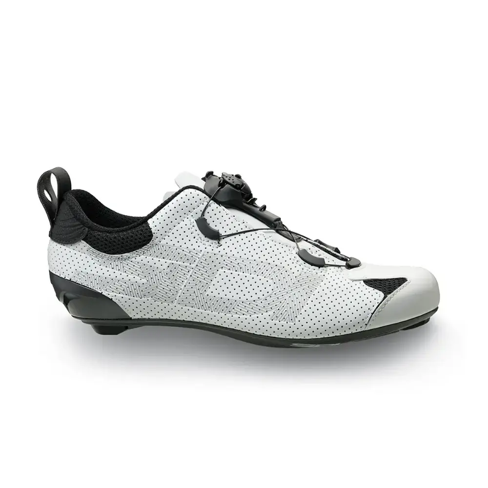 De Sidi Tri-Sixty wielrenschoenen zijn ontworpen voor de beste triatleten ter wereld. Met een C-Boost carbon zool en een draaiknoopsysteem met duurzame Dyneema kabels zijn deze schoenen in een mum van tijd klaar voor actie. Het geperforeerde Microfibre Techpro en mesh bovenwerk zorgt voor optimale ventilatie, terwijl de geïntegreerde hiel en het Tecno-3 Push Flex-systeem drukpunten elimineren en een perfecte pasvorm garanderen. Ideaal voor intensieve races.