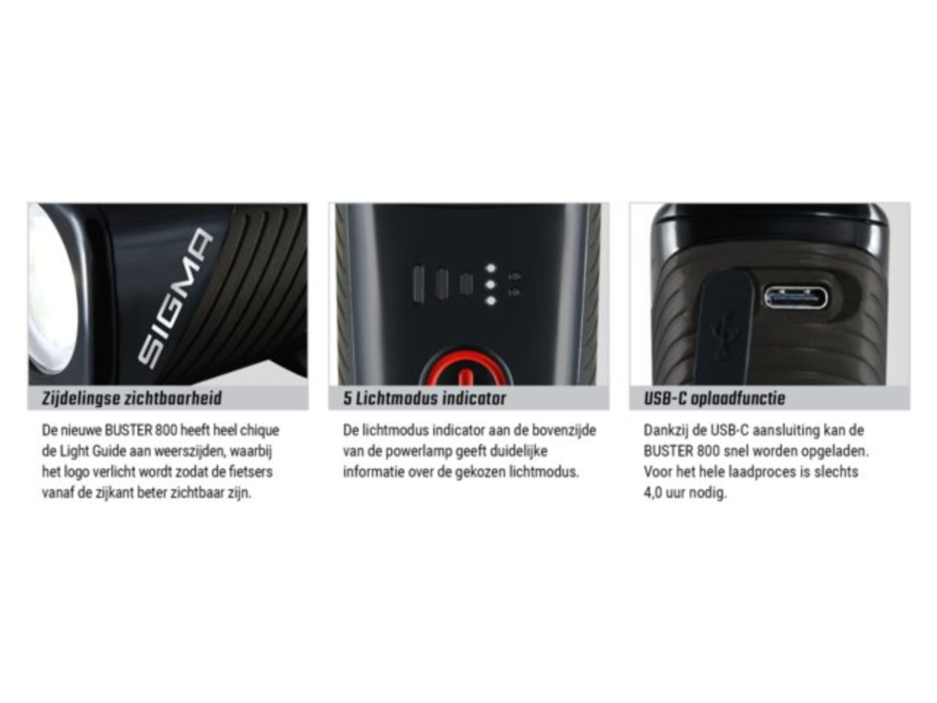 Koplamp De Sigma Sport Buster 800 Koplamp is compact, maar heeft veel te bieden. De lamp heeft 5 verschillende standen die er allemaal voor zorgen dat je beter zichtbaar bent voor andere weggebruikers. Er is een dagrijstand beschikbaar, waarbij de accu tot maar liefst 25 uur meegaat. De steun waarmee je de lamp vast zet op de helm stevig en maakt het makkelijk de lamp los en vast te maken.