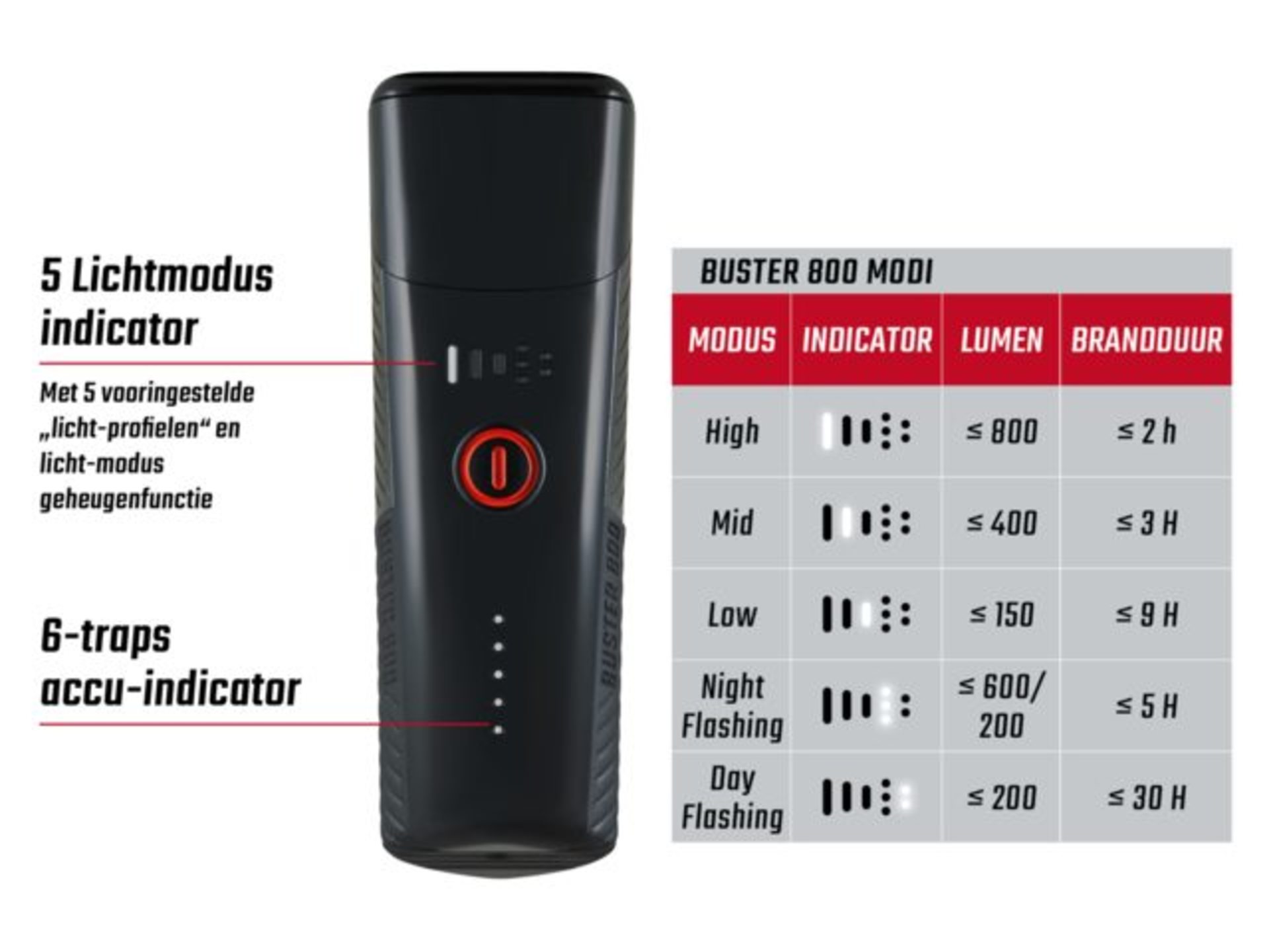 Achterlicht De Buster RL 80 levert tot 80 lumen licht en biedt daarmee niet alleen ‘s nachts goede zichtbaarheid, maar is ook meer dan helder genoeg voor tochten overdag. Ideaal voor woon-werk verkeer bijvoorbeeld. Er zijn vijf lichtmodi om uit te kiezen: Hoog, Laag, Dagknipper, Nachtknipper en Ecoknipper. In de lichtere standen gaat de lamp tot 12 uur mee op een acculading. Dankzij de USB-C aansluiting kan het achterlicht in slechts 2 uur worden opgeladen.