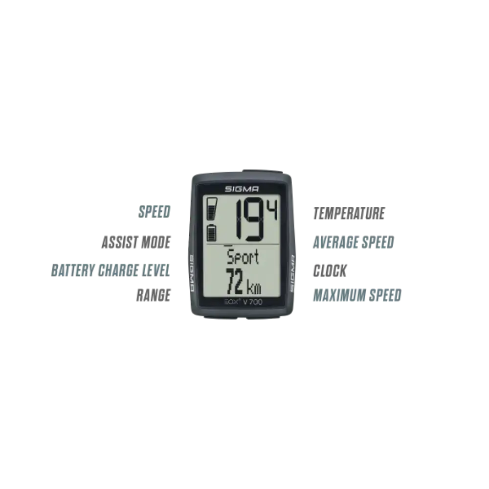 Toont essentiële e-bike functies zoals snelheid, ondersteuningsstand, oplaadstatus en lichtstatus