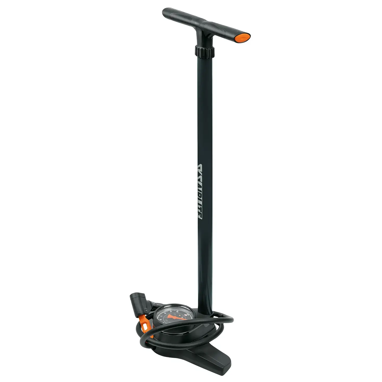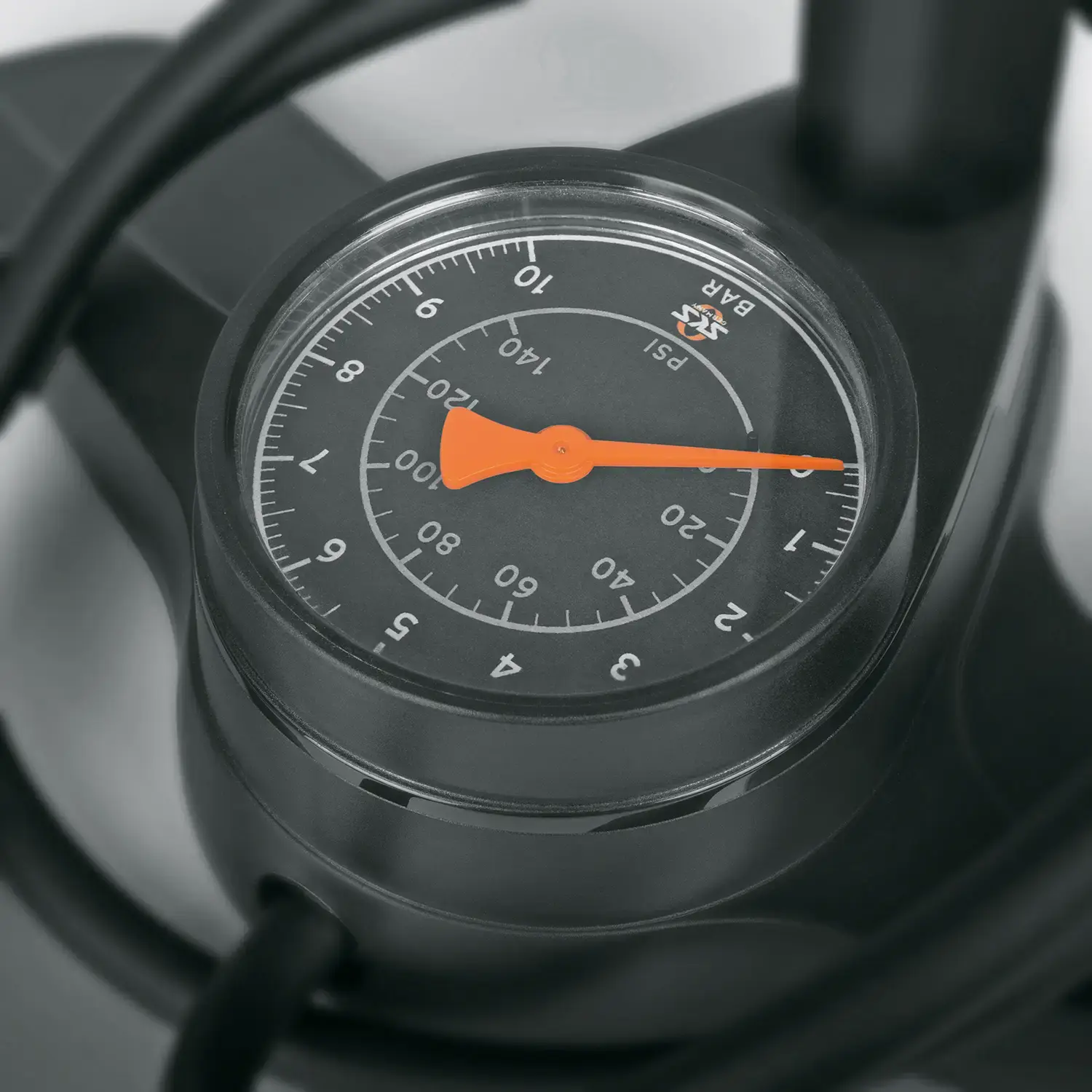 De SKS Airlite Fietspomp is een compacte en betrouwbare vloerpomp voor dagelijks gebruik. Dankzij de MULTI VALVE-kop (MV EASY) is de pomp geschikt voor alle gangbare ventielen (SV, AV en DV). De grote analoge precisiemanometer geeft de druk duidelijk weer tot 10 bar, zodat je altijd met de juiste bandenspanning onderweg bent. De stevige stalen buis in combinatie met de stabiele kunststof voet zorgt voor duurzaamheid en stabiliteit bij elke pompslag. De ergonomische greep ligt prettig in de hand en maakt het pompen comfortabel. Subtiele oranje details geven de pomp een moderne en sportieve uitstraling. Gemaakt in Duitsland voor maximale kwaliteit en betrouwbaarheid.