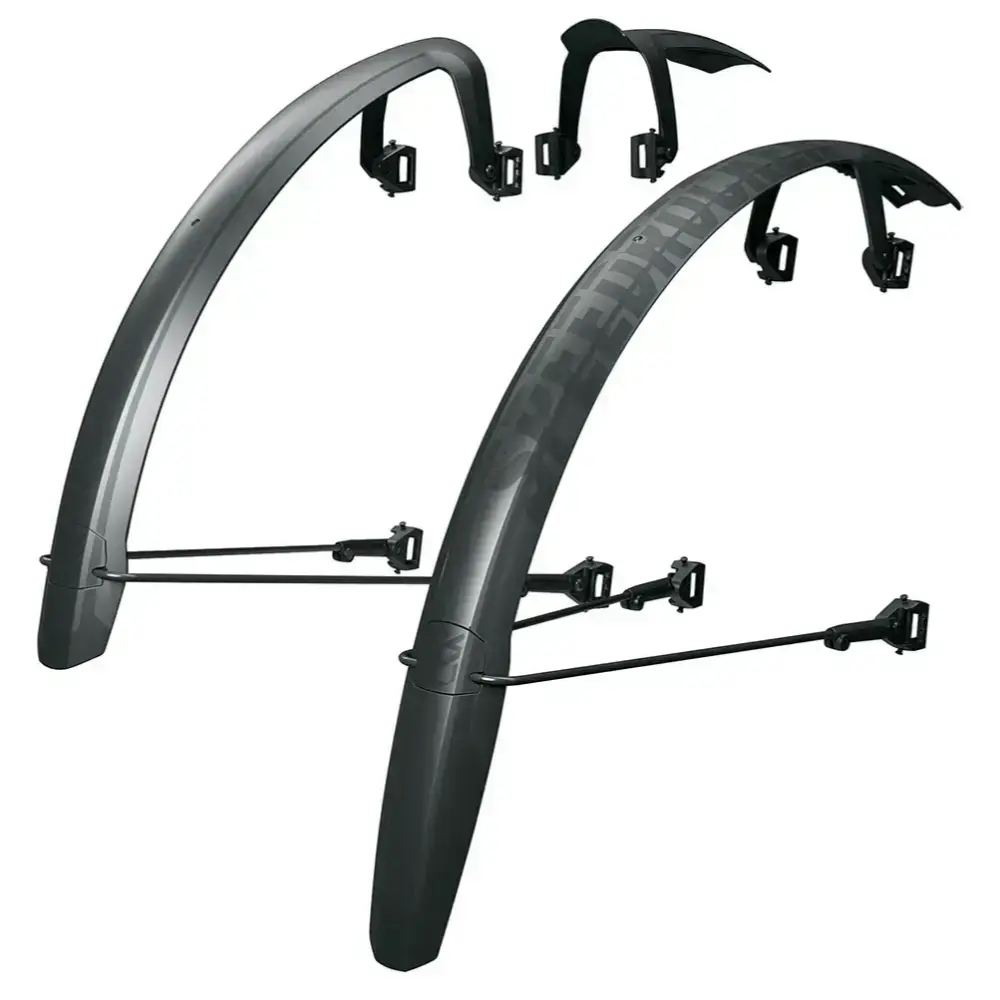 De SKS Speedrocker XL Spatbordenset is dé keuze wanneer je een spatbord zoekt die je niet onder je voorvork hoeft te monteren. Het zeer innovatieve voorspatbord bestaat uit twee delen, die via je voorvork verbonden zijn met elkaar. Dankzij de rubberen bescherming die je op je voorvork bevestigt, bestaat er geen gevaar voor beschadiging van je (carbon) voorvork. Dit systeem zit zeer stevig vast en beschermt je voorwiel tegen al het opspattende vuil. Het achterspatbord wordt op dezelfde wijze bevestigd. Deze spatbordenset zit daardoor uitzonderlijk stevig vast! Ideaal voor avonturiers die graag het asfalt achter zich laten en houden van modderige paden in het bos. Deze spatborden zijn geschikt voor bredere banden van 32-52 mm dik, wat ze ideaal maakt voor cyclocrossers en gravelbikes.