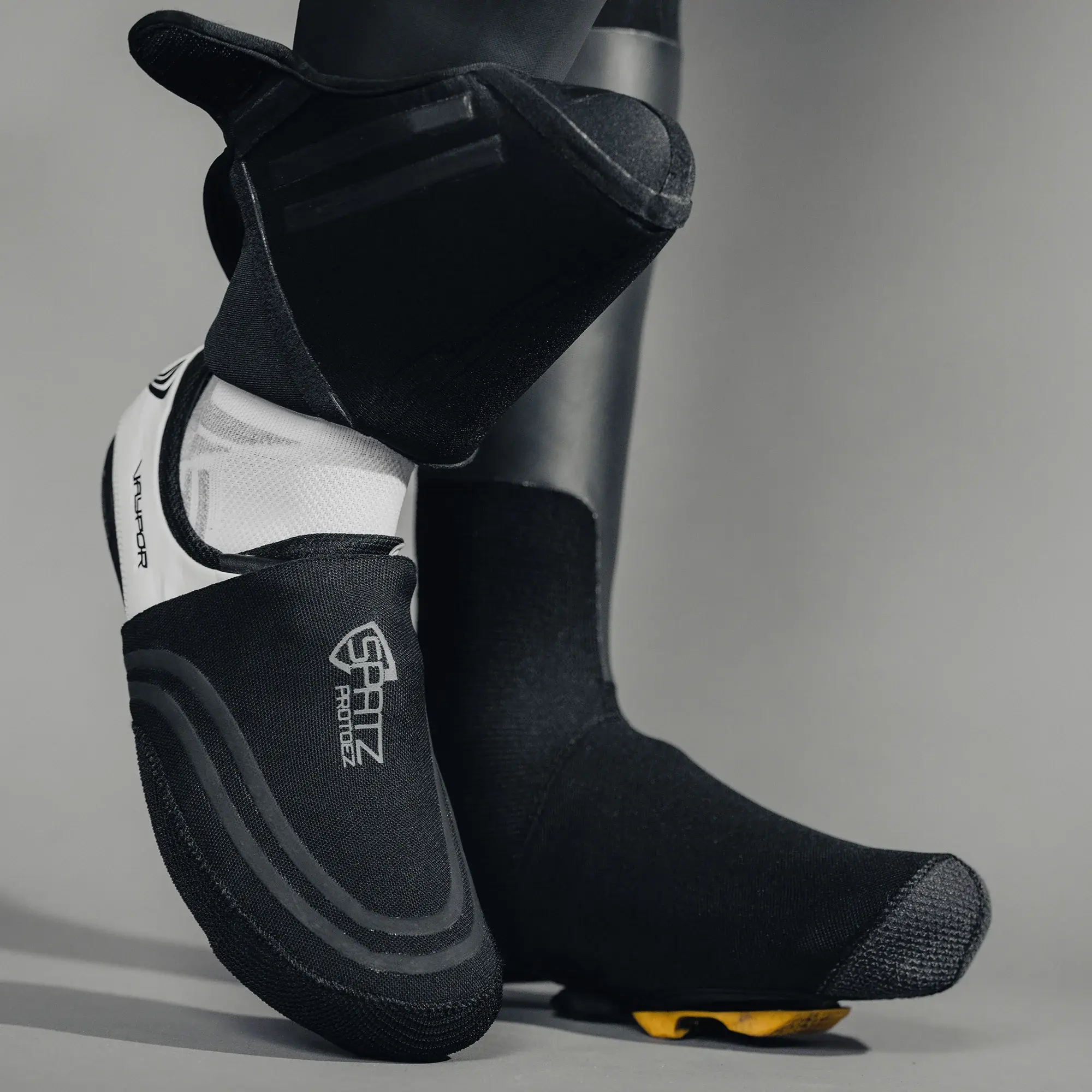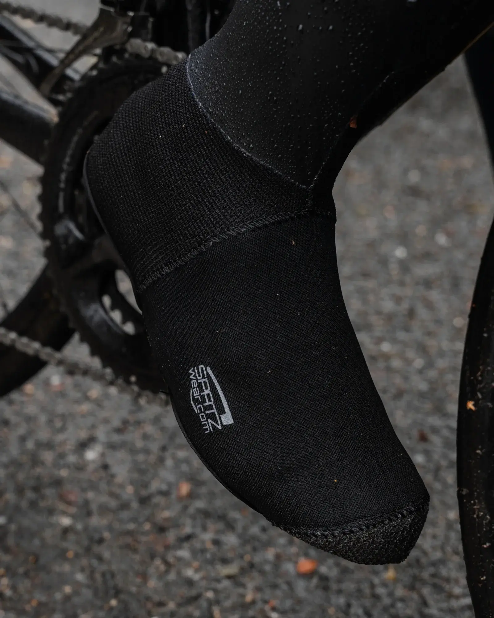 De Spatzwear Pro Stealth Layering Overschoenen zijn ontworpen voor fietsers die het uiterste vragen van hun uitrusting in extreme koude en natte omstandigheden. Dit tweedelige systeem bestaat uit de overschoenen zelf en de Protoez Toe Warmers, die samen ongeëvenaarde bescherming bieden tegen kou en vocht. De overschoenen kunnen alleen gedragen worden bij temperaturen boven 3–5°C. Bij lagere temperaturen voeg je de Protoez Toe Warmers toe voor maximale isolatie. De silicone afdichtingen aan de binnen- en buitenkant van de toe warmers integreren perfect met de overschoenen, waardoor waterinslag drastisch wordt verminderd.