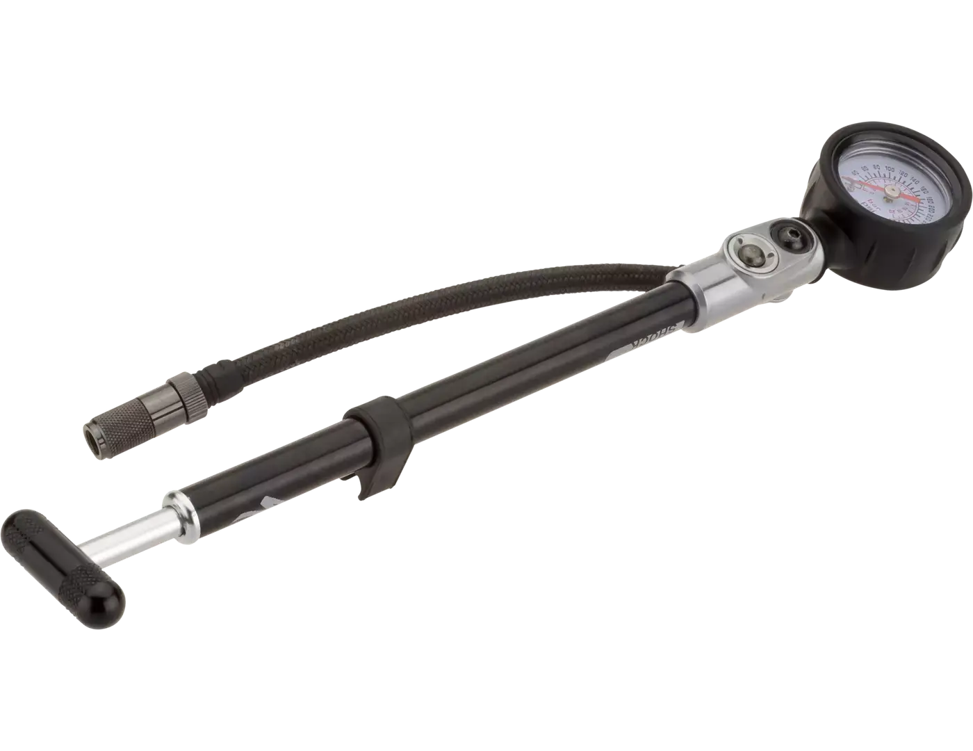 De Air Tool Shock Voorvorkpomp is een hogedruk pomp die ontwikkeld is voor het snel en precies oppompen van achterdempers en voorvorken. De tweetraps kop is zo ontworpen dat je het Schrader ventiel eerst afsluit en daarna de kop van de demper haalt. Daardoor verlies je geen druk en klopt de druk precies met wat de drukmeter aangeeft.
