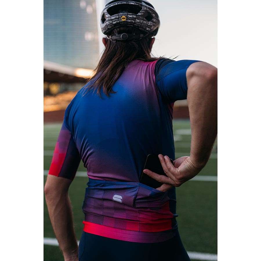 Het Sportful Rocket Fietsshirt ziet er niet alleen goed uit, maar zit vol technische functies. Zo is het gemaakt van een dunne, lichte stof die prettig aanvoelt op de huid. Deze stof voert zweet snel af, waardoor jij langer fris op de fiets kunt blijven. Dit wordt versterkt door de panelen en mouwen die zijn gemaakt van een nog dunner, open geweven polyester. Daar kan de wind als het ware doorheen waaien, waardoor zweet meteen wordt meegenomen. Het shirt blijft goed zitten dankzij een grip tape onderin het shirt. Op de achterzijde zijn drie verstevigde zakken aangebracht. De spullen blijven daardoor goed in de zakken zitten en het shirt gaat niet scheef hangen.