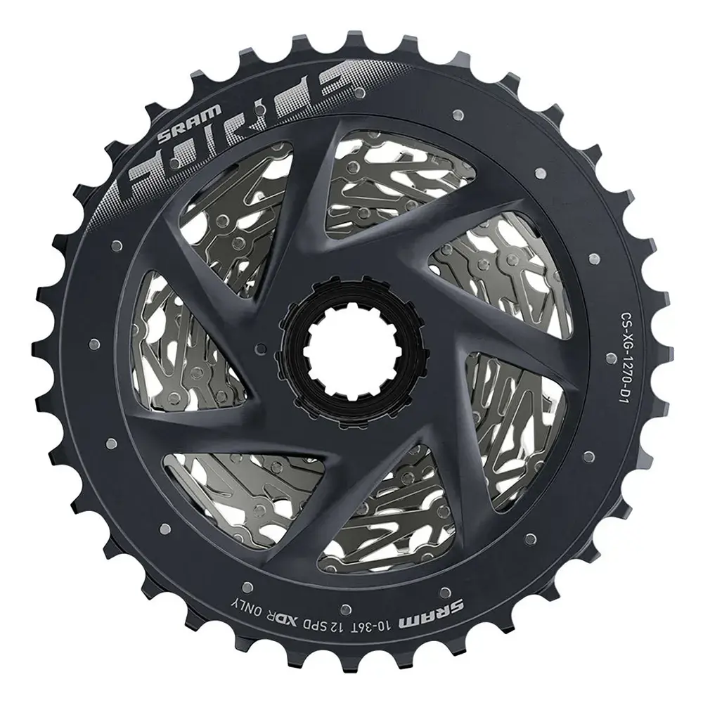 De SRAM XG1270 D1 Cassette biedt een ongeëvenaard schakelniveau in een aantrekkelijk jasje. SRAM heeft de traditionele krans van 11 tanden vervangen door een 10-tandige krans, waarmee je schakelbereik met 12-speed nog groter wordt. 10 tanden draaien niet goed? Zeker wel, deze krans draait als een trein! De stappen zijn bij deze cassette zeer klein. Dit is ook de grote winst van 12-speed: je vindt er altijd de juiste versnelling mee, zonder vast te blijven zitten in “net te klein, net te groot”. Deze cassette is alleen te gebruiken met SRAM XDR Body’s.