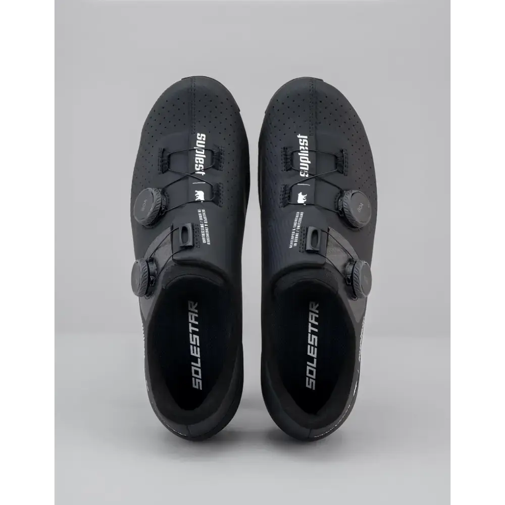 De Road Pro wielerschoenen van Suplest zijn gemaakt om te racen op het hoogste niveau. Het bovenwerk is voorzien van een 'sandwichconstructie': de 3-mesh is aan beide kanten gecoat met een dunnen TPU-laag, waardoor de schoen comfortabeler zit. Bij de voorvoet is gebruik gemaakt van een zogenaamde 'Flex ZONE'. Dit zorgt er voor dat je comfortabeler het pedaal omlaag duwt. Je voeten worden goed op hun plaats gehouden: de schoenen zijn uitgerust met BOA sluitingen en een 3D-hielkap. De stijve ERGO carbonzool wordt gecombineerd met een SOLESTAR binnenzool. Deze combinatie zorgt ervoor dat je een efficiënte krachtoverbrenging hebt op je pedalen gedurende je rit. Als je een racefietsschoen zoekt met optimale prestaties is de Road Pro de schoen die je zoekt.