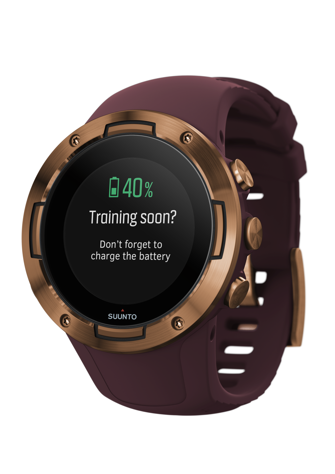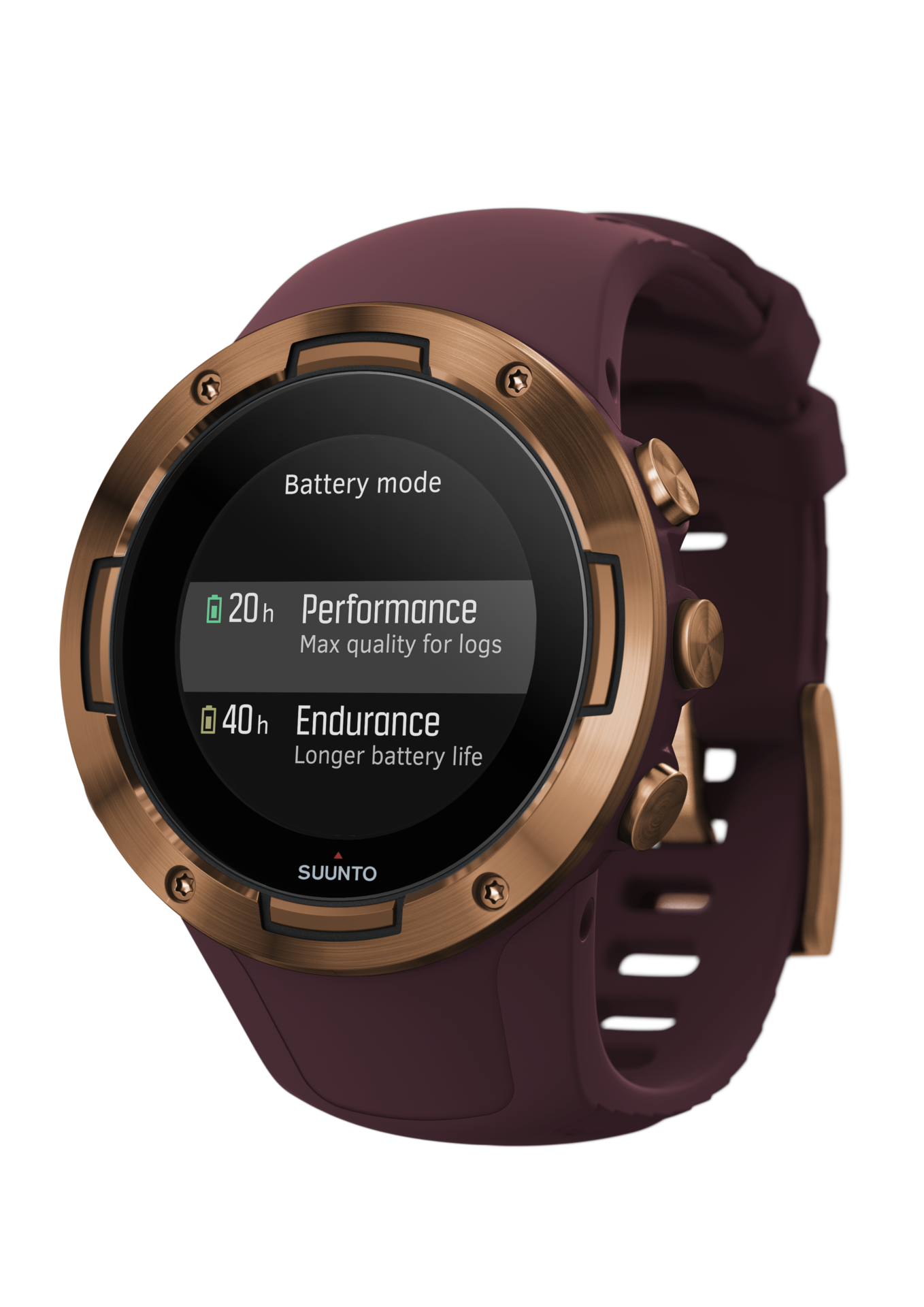 De batterij van de Suunto 5 is voorzien van een aantal handige standen. Wanneer het horloge alleen gebruikt wordt voor de tijd, gaat het horloge 14 dagen mee. Zodra het horloge overschakelt op de trainingsmodus, gelden er verschillende tijden van duur. Zo gaat het horloge 20 tot 40 uur mee in GPS tracking modus en 7 dagen met 24/7 tracking aan.