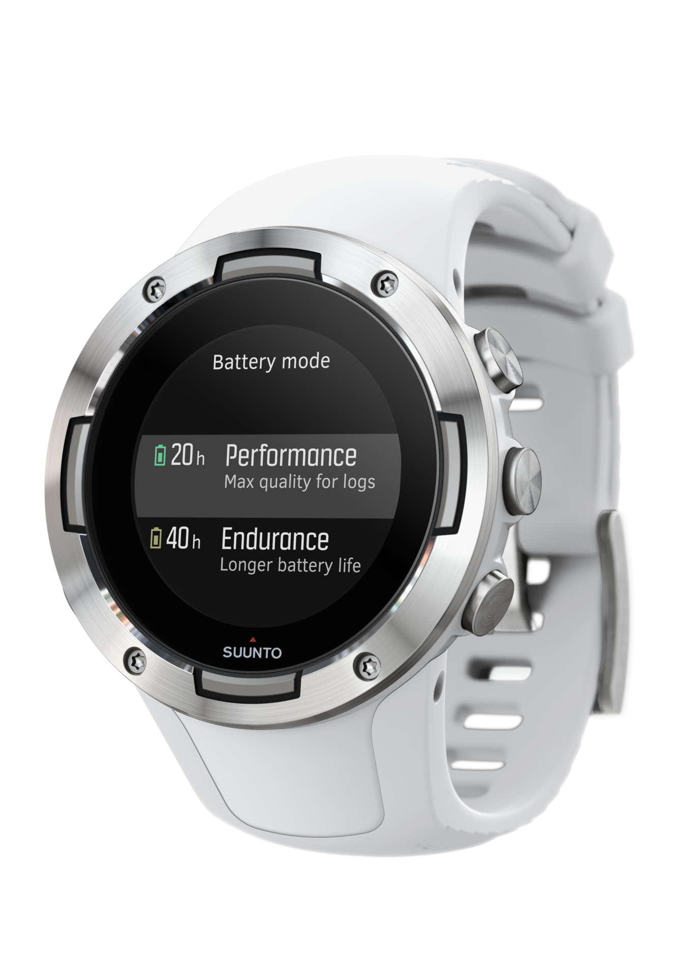 De batterij van de Suunto 5 is voorzien van een aantal handige standen. Wanneer het horloge alleen gebruikt wordt voor de tijd, gaat het horloge 14 dagen mee. Zodra het horloge overschakelt op de trainingsmodus, gelden er verschillende tijden van duur. Zo gaat het horloge 20 tot 40 uur mee in GPS tracking modus en 7 dagen met 24/7 tracking aan.