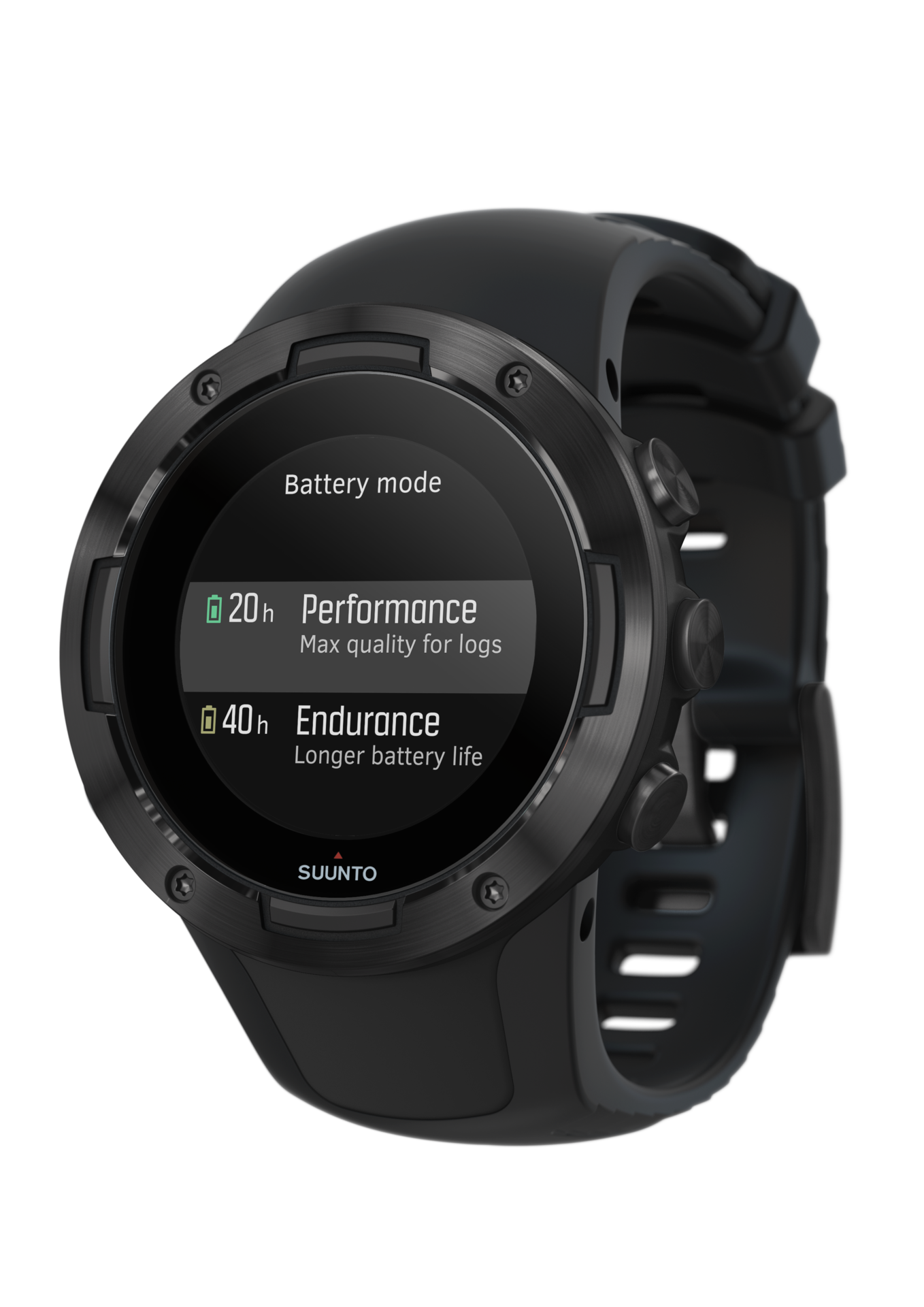 De batterij van de Suunto 5 is voorzien van een aantal handige standen. Wanneer het horloge alleen gebruikt wordt voor de tijd, gaat het horloge 14 dagen mee. Zodra het horloge overschakelt op de trainingsmodus, gelden er verschillende tijden van duur. Zo gaat het horloge 20 tot 40 uur mee in GPS tracking modus en 7 dagen met 24/7 tracking aan.