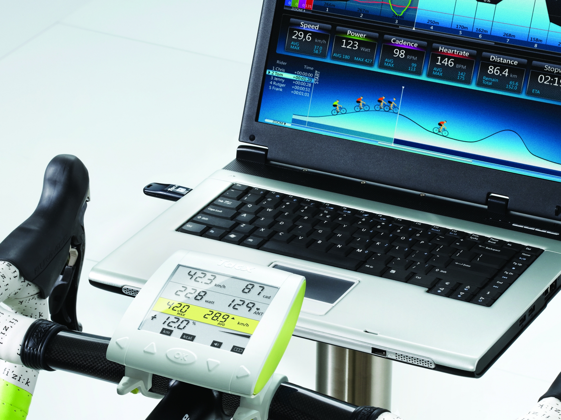 De stuurcomputer van de Tacx i-Vortex Trainer heeft geen geheugen programma’s in hellingshoek, vermogen of hartslag stel je handmatig in tijdens de training. De ANT+ dongle zorgt voor draadloze communicatie tussen de i-Vortex en de PC. Deze Tacx i-Vortex Trainer werkt net als de i-Genius met de meest uitgebreide versie van de Tacx Trainer Software 4, Advanced.