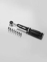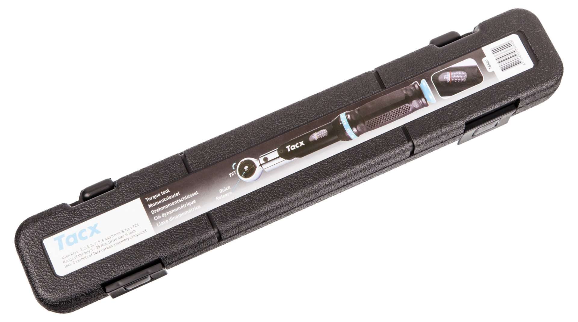 De Tacx momentsleutel Torque wrench is een breed inzetbare en hoogwaardige sleutel die erg handig is bij het aandraaien van moeren en bouten. De momentsleutel heeft een bereik van 5-25 Nm en een micrometer venster om eenvoudig de gewenste waarde in te stellen. De sleutel wordt met een set bit van M2 t/m m8 en een torx T25 geleverd (meest gebruikte bits) in een handig opbergdoosje. Ook worden er 3 zakjes montagepasta voor carbon onderdelen meegeleverd.