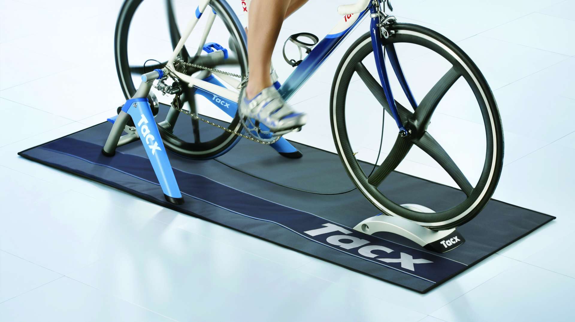 De meegeleverd Tacx trainingsmat zorgt voor een aanzienlijke afname van het geluid en zorgt er tegelijkertijd voor dat je zweet niet op de grond maar op de mat valt.