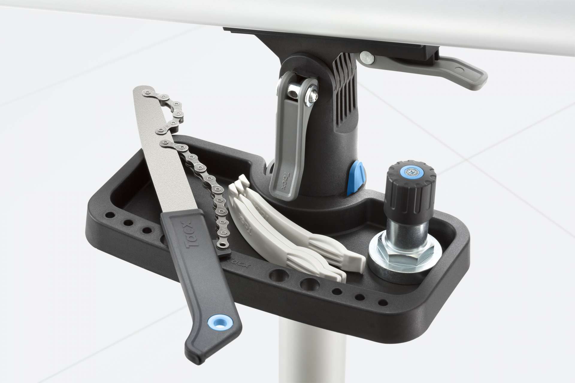 De T3350 is een doorontwikkeling van de al fantastische T3050 standaard. De T3350 standaard is speciaal ontworpen op verzoek van diverse mecaniciens. Zij zijn de professionals die de fietsen van de renners in topconditie afleveren en voor wie eersteklas materiaal een vereiste is. De fiets wordt aan de voor- of achtervork geklemd. De kunststof bracketsteun is zodanig geconstrueerd dat de fiets tijdens alle werkzaamheden stevig in positie blijft en geschikt is voor fietsen met afwijkende brackets. De stabiele aluminium standaard, met verplaatsbaar montageblad, is uitgevoerd met een inklapbaar driepoot-statief en het werkoppervlak kan in 360 graden draaien.